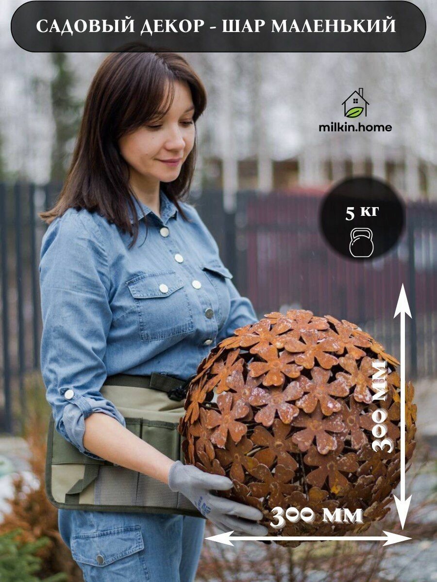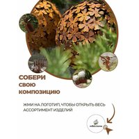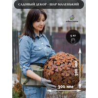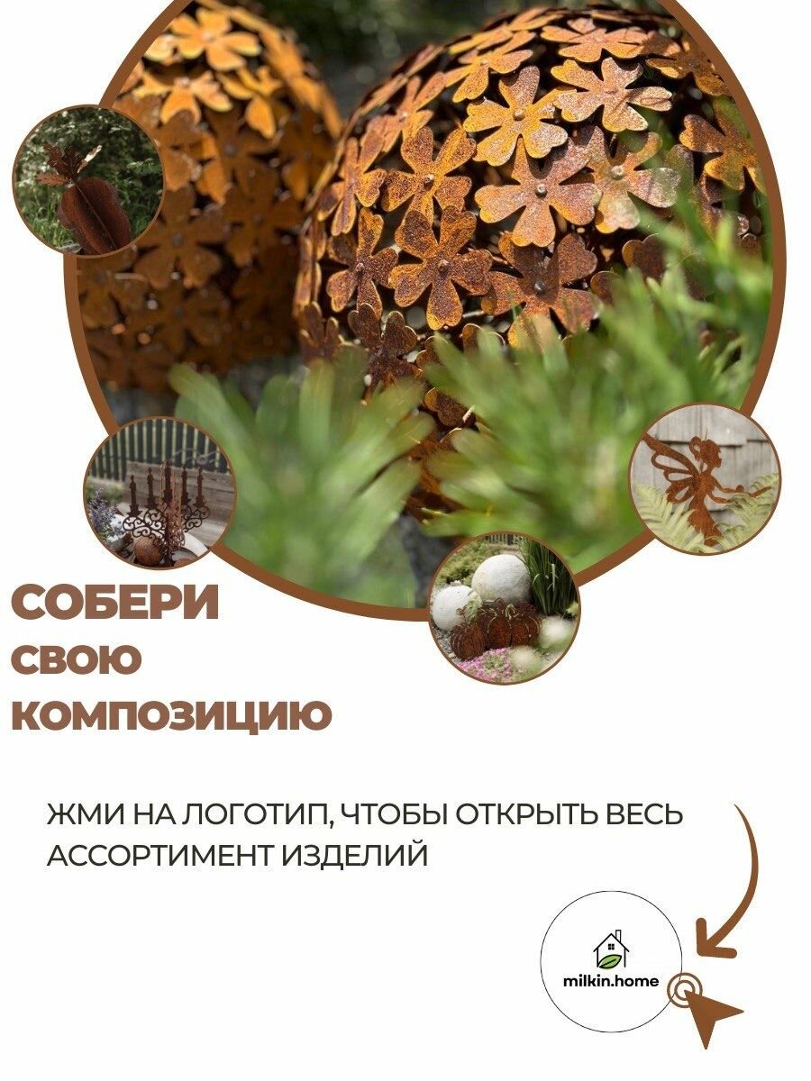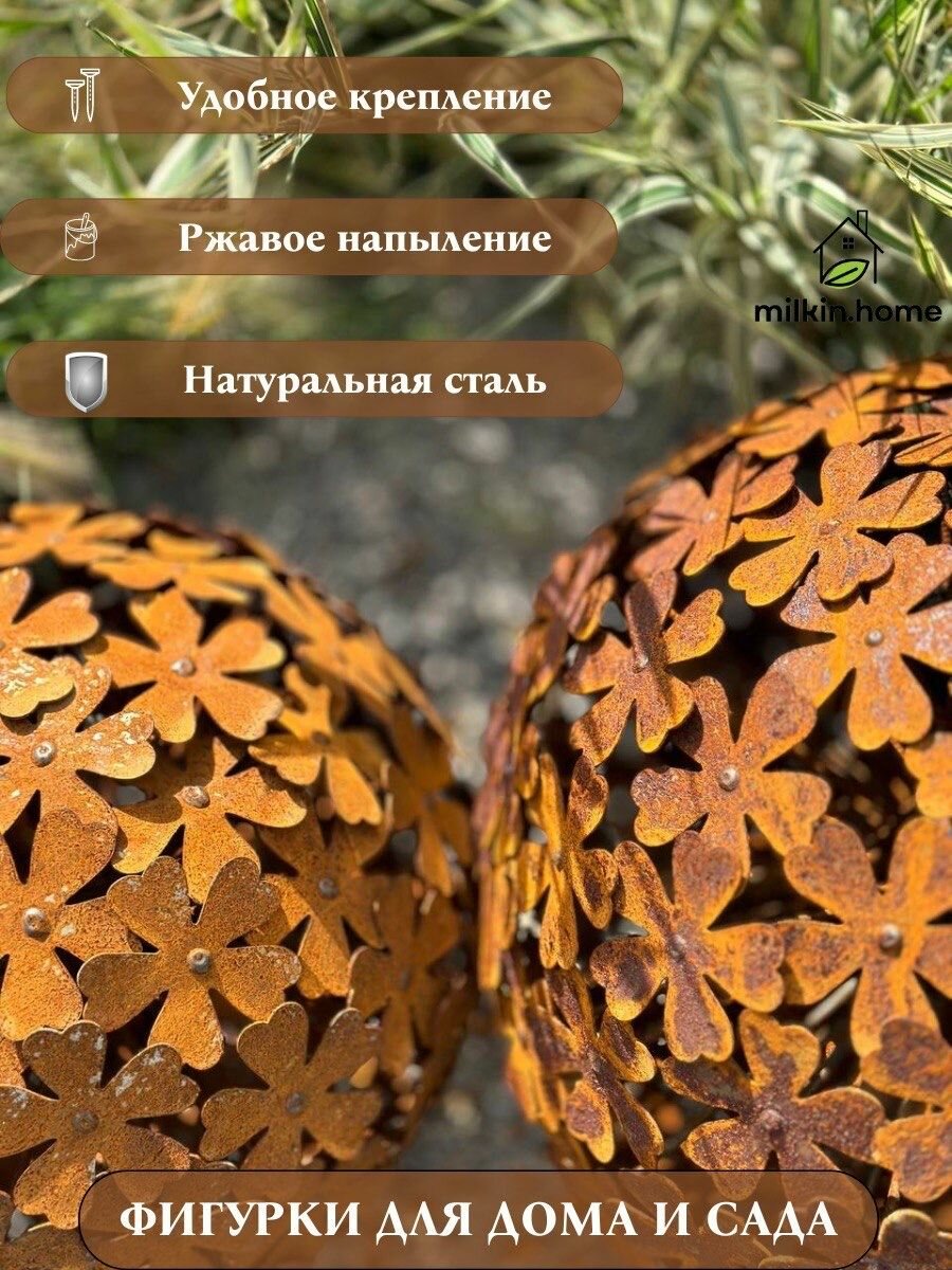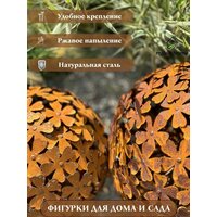 Шар с цветочками декоративный выполнен из качественного железа. Он прослужит Вам многие годы. Идеальный декор для сада, может использоваться как самостоятельный элемент в различных композициях. Не деформируется, не продавливается под тяжестью снега, не портится от осадков и солнечных лучей при использовании на улице. Покрытие шара выполнено с эффектом ржавчины, что придаёт натуральный состаренный вид.