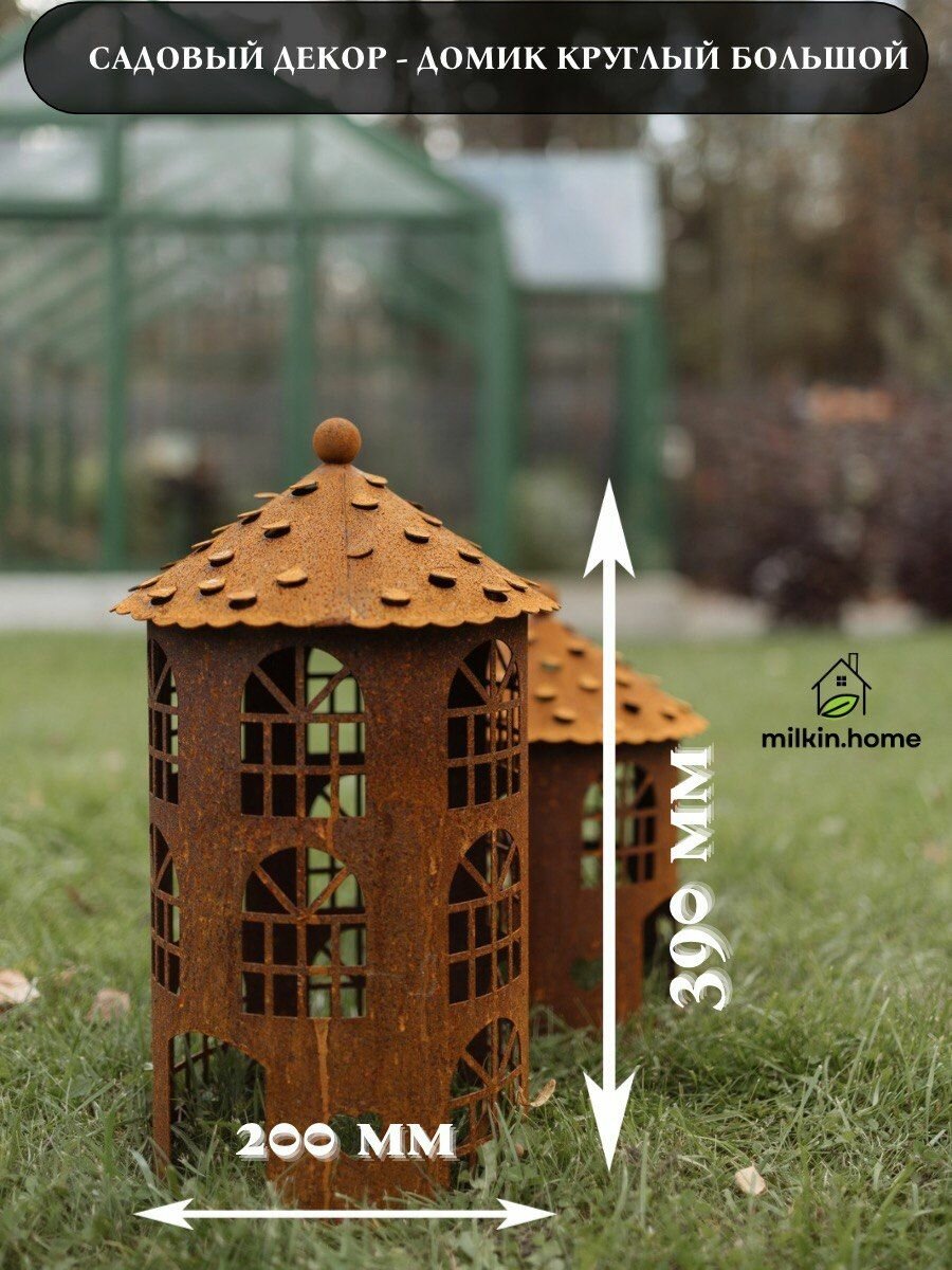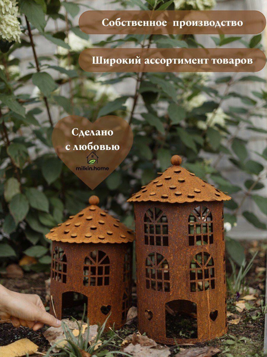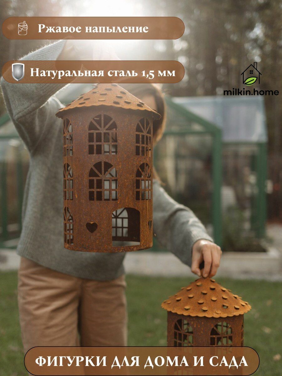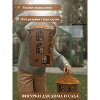 Домик - подсвечник выполнен из качественного железа. Он прослужит Вам многие годы. Идеальный декор для сада, может использоваться как самостоятельный элемент в различных композициях. Можно дополнить лампочками на солнечных батарейках, а можно установить внутри свечку, что сразу же придаёт ему волшебный вид. Не деформируется, не продавливается под тяжестью снега, не портится от осадков и солнечных лучей при использовании на улице. Покрытие домика выполнено с эффектом ржавчины, что придаёт натуральный состаренный вид.