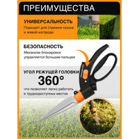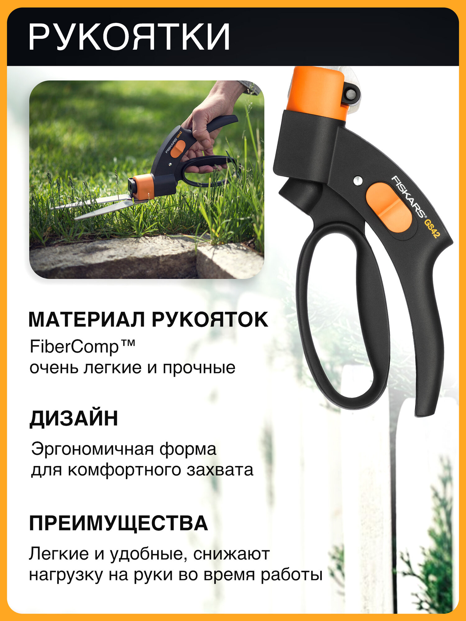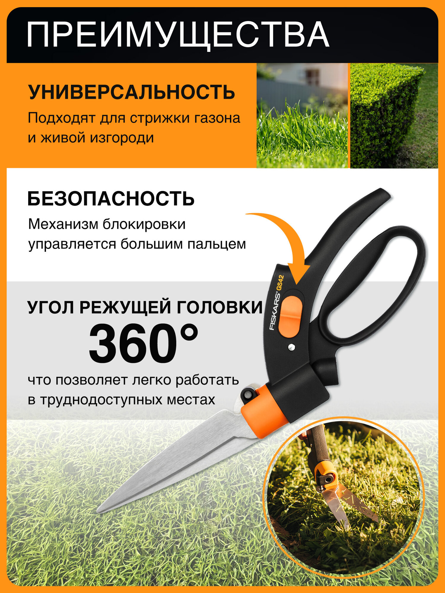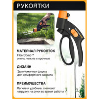 Ножницы для живой изгороди GS42 FISKARS (1000589) длиной 32 см предназначены для различных видов садовых работ, таких как подравнивание кустов и углов, фигурной обрезки живой изгороди, удаления сухих листьев с кустарников и мелких деревьев. Удобны для подрезки травянистых растений и краев газона. Инструмент имеет регулируемый угол режущей головки 360°, удобно работать в труднодоступных местах под любым углом. Ножницы садовые механические снабжены прочным механизмом, который обеспечивает максимальное режущее усилие и снижает нагрузку на руку при срезе твердых стеблей растений. Дачный хозяйственный инвентарь имеет легкий вес 309 гр, подходит для пользователя с любой физической подготовкой. Ручки выполнены из полиамида, усиленного стекловолокном, который обеспечивает легкость и прочность прибора. Комфортное покрытие рукояток гарантирует удобство захвата и отсутствие скольжения рук. Прямые лезвия выполнены из стали двойной закалки и имеют специальное покрытие, которое повышает антифрикционные свойства. Они долго остаются острыми, срез получается чистый и ровный. Остроконечные лезвия надежно соединены с рукоятками болтами. Ножницы садовые ручные подходят как для садоводов-любителей, так и для профессионалов для женских и мужских рук. Садовый инструмент GS42 FISKARS (1000589) создан для обрезания, края газона, цветов, травы и живой изгороди, для стрижки кустарников и декоративных деревьев. Безопасные ножницы fiskars помогут содержать беспорядочную живую изгородь и массивные кусты в форме. Садовый режущий инструмент имеет механизм блокировки для удобного хранения и транспортировки инструмента. Универсальный веткорез можно использовать как ножницы для цветов, комнатных растений для орхидей и роз. Применимы в цветоводстве, отличные помощники для флориста. Подходят для санитарной и сезонной обрезки. Своевременная обрезка укрепляет здоровье растений, улучшает их внешний вид и плодовитость. Если вы любите чёткие прямые линии или увлекаетесь фигурной стрижкой кустарников, то приобретение этого инструмента просто необходимо. Что бы подготовить всё для сада и огорода к началу сезона выберите подходящие бытовые ножницы для растений исходя из режущей способности и размера. Ножницы садовые GS42 FISKARS (1000589) остаются одним из основных инструментов на даче или частном участке, особенно если там есть фруктовый сад или зеленые стенки. Для того, чтобы продлить срок службы садовой утвари нужно помнить, что ее стоит использовать только по назначению, для работы с растительным материалом. После каждого применения очищать лезвия промасленной ветошью. Инструмент GS42 FISKARS (1000589) станет прекрасным сезонным подарком любимому, папе, маме, бабушке, дедушке, другу. Садовая техника FISKARS станет надежным и удобным помощником в обрезке растений, обеспечивая точные и аккуратные результаты. Гарантийный срок 2 года.