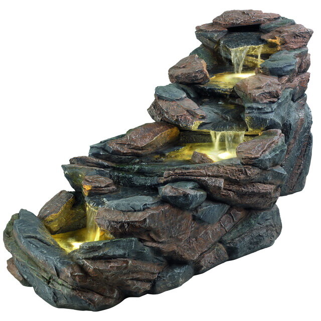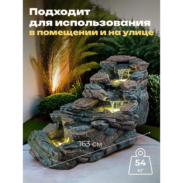 За счет интересного сочетания двух оттенков декоративный водопад-фонтан напоминает небольшую гору, где бьет подземный источник. Теплые огоньки, спрятанные на выступах, подсвечивают струящийся каскад, добавляя ему загадочного очарования. Созерцание бегущей воды, "оттененной" сиянием, поможет расслабиться, принесет умиротворение и эстетическое удовольствие. Садовый фонтан с подсветкой гармонично впишется в оформление дворовой территории. Особенно волшебно он будет смотреться в темное время суток, когда фонарики будут мягко озарять пространство вокруг.