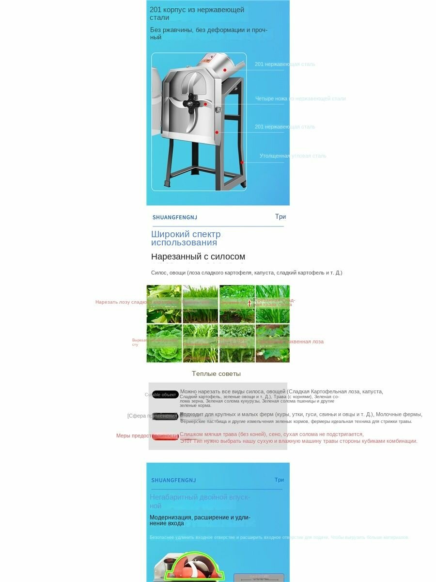 Тип продукта: Измельчитель зеленых кормов Применимая область применения: Животноводство, аквакультура Напряжение: 220 В Применимый сценарий: Мощность: 1000 ВтКрасивые продукты