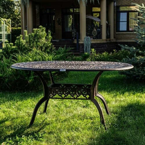 Обеденный стол WILHELM – отличное решение для тех, кому важно не только удобство мебели, за которой можно приятно и комфортно провести время с близкими людьми и семьей, но и ее дизайн. Обеденный стол, выполненный из литого алюминия, имеет идеальную овальную форму и аристократичный, благородный бронзовый цвет, который отдает металлическим блеском, за счет которого создает уникальный и привлекательный контраст с зелеными пространствами загородных домов и дач.