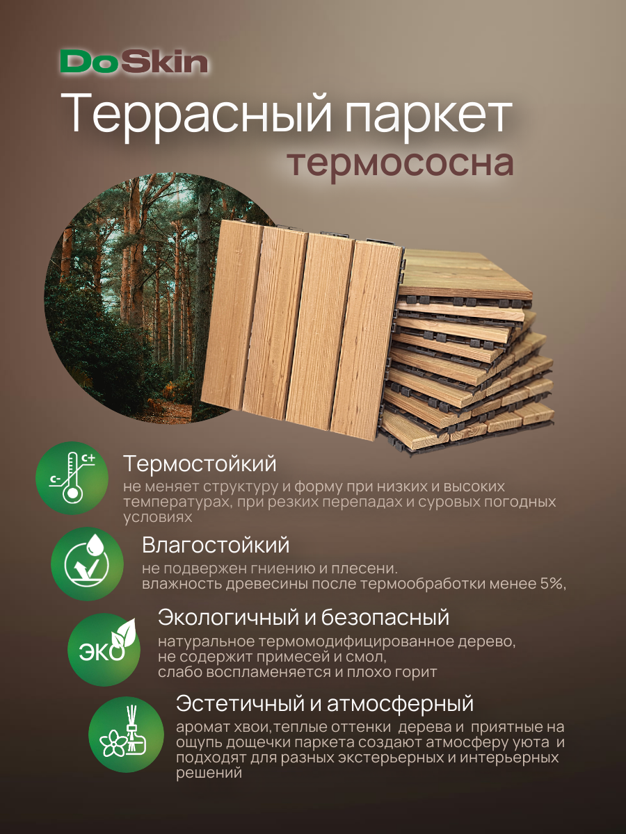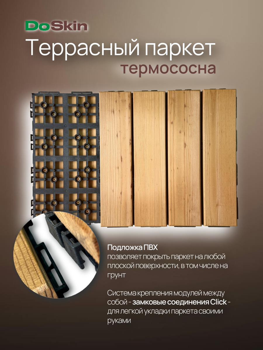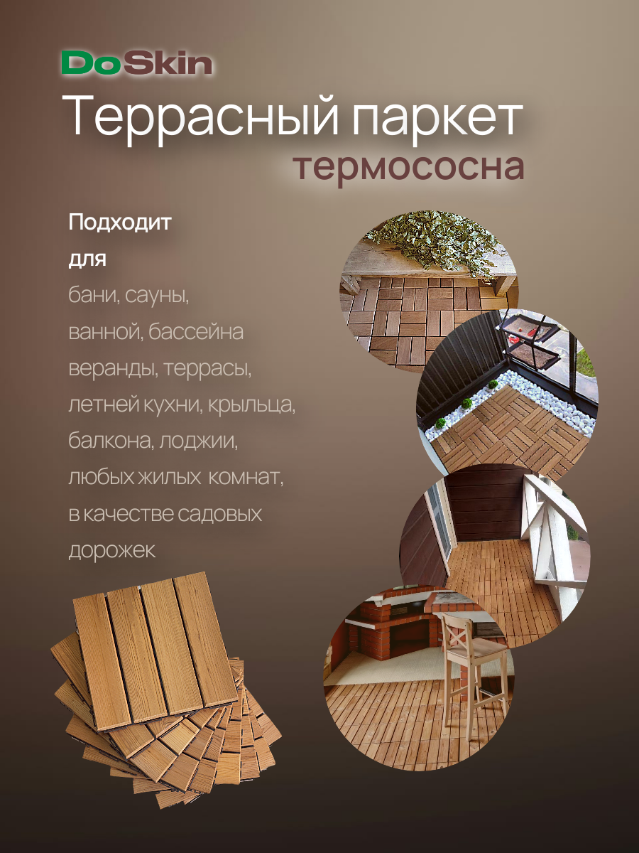Террасный паркет Doskin - универсальное напольное покрытие для настила на верандах, балконах, улице, банях, саунах, а также в качестве садовых дорожек, тротуарной плитки или дорожек для бассейна.