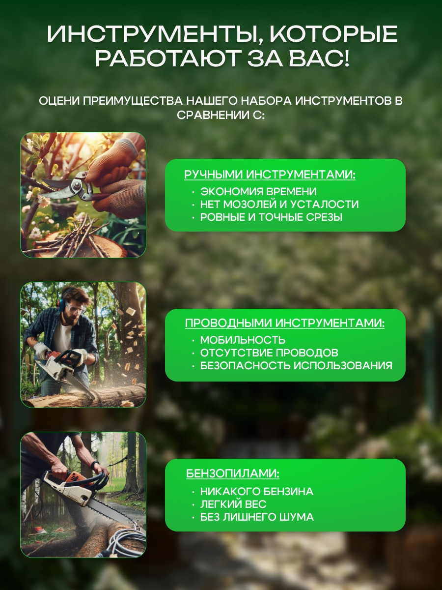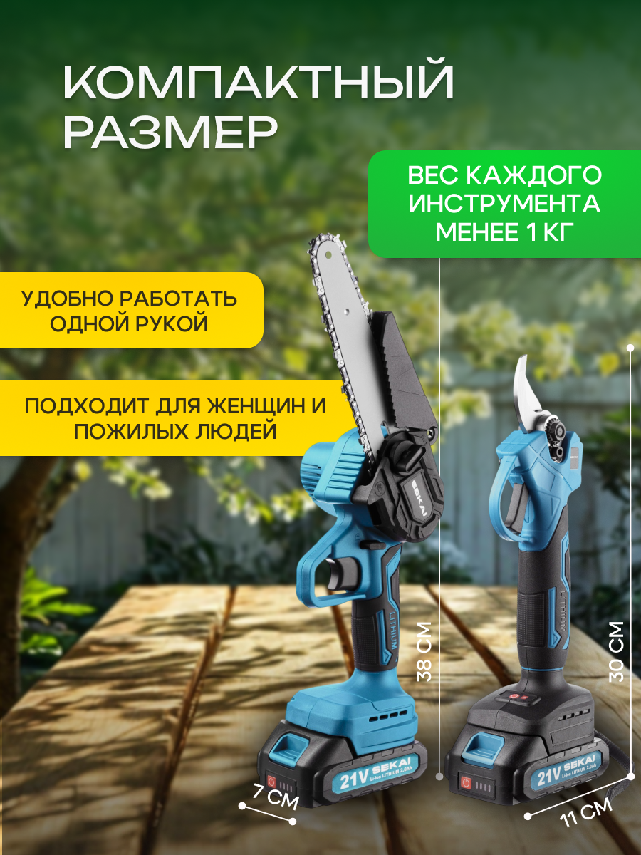 Представляем вашему вниманию универсальный набор 2 в 1: аккумуляторный секатор и цепная пила — идеальное решение для ухода за садом и участком! Этот комплект подойдет как для мужчин, так и для женщин, ценящих качество и удобство в работе.