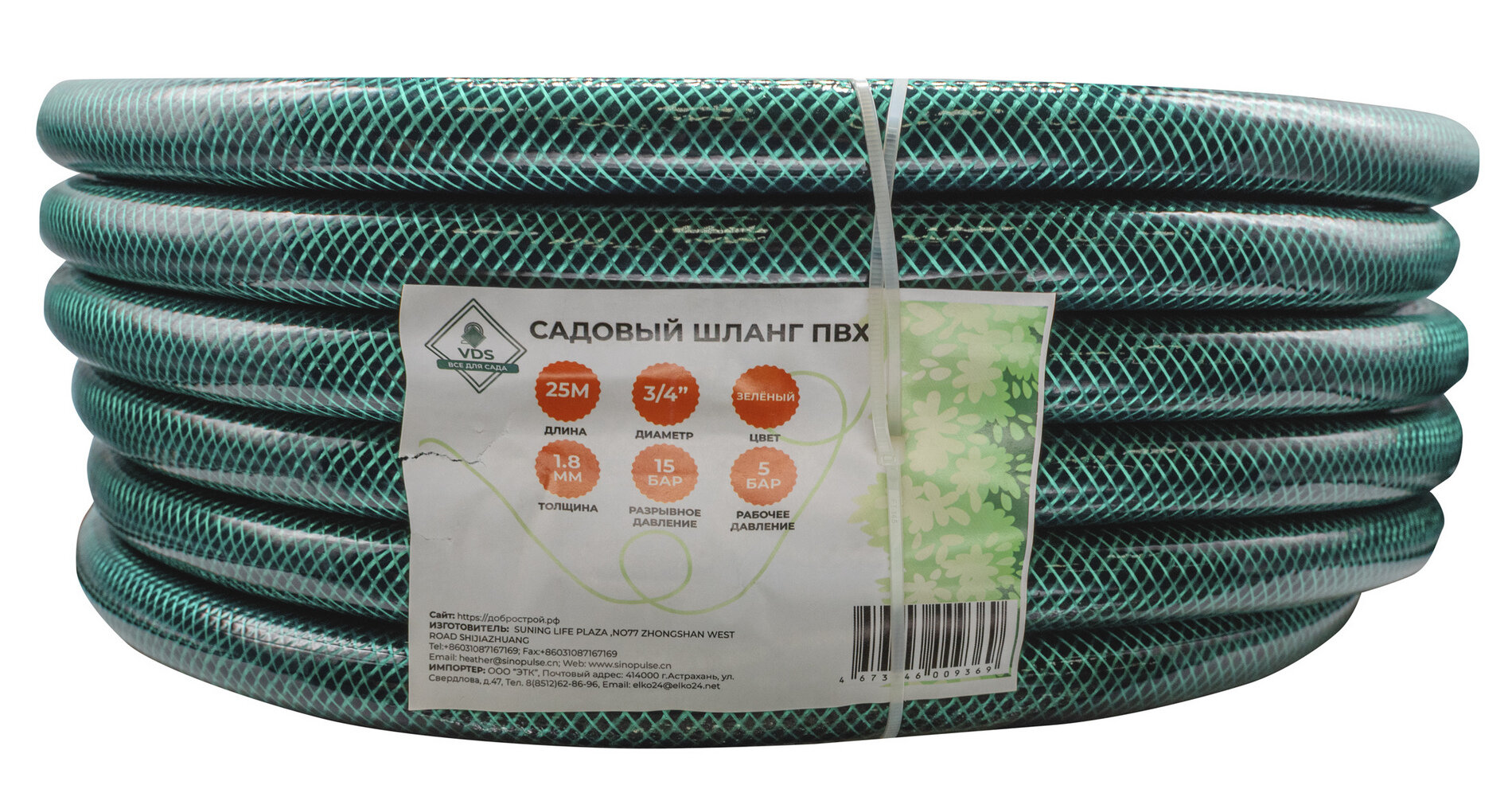 Шланг для полива применяется на садовых участках для полива растений. Можно использовать не только для полива, но и для организации питьевого водоснабжения и перекачки пищевых жидкостей. Изготовлен из высококачественного ПВХ, который представляет собой эластичный полимер, способный выдерживать интенсивные эксплуатационные нагрузки. Во время использования не перегибается и не перекручивается. Устойчив к УФ лучам. Цвет – зеленый. Диаметр — 3/4 дюйма. Длина шланга — 25 м. Рабочее давление – 5 Бар. Разрывное давление – 15 Бар. Толщина 1,8 мм.