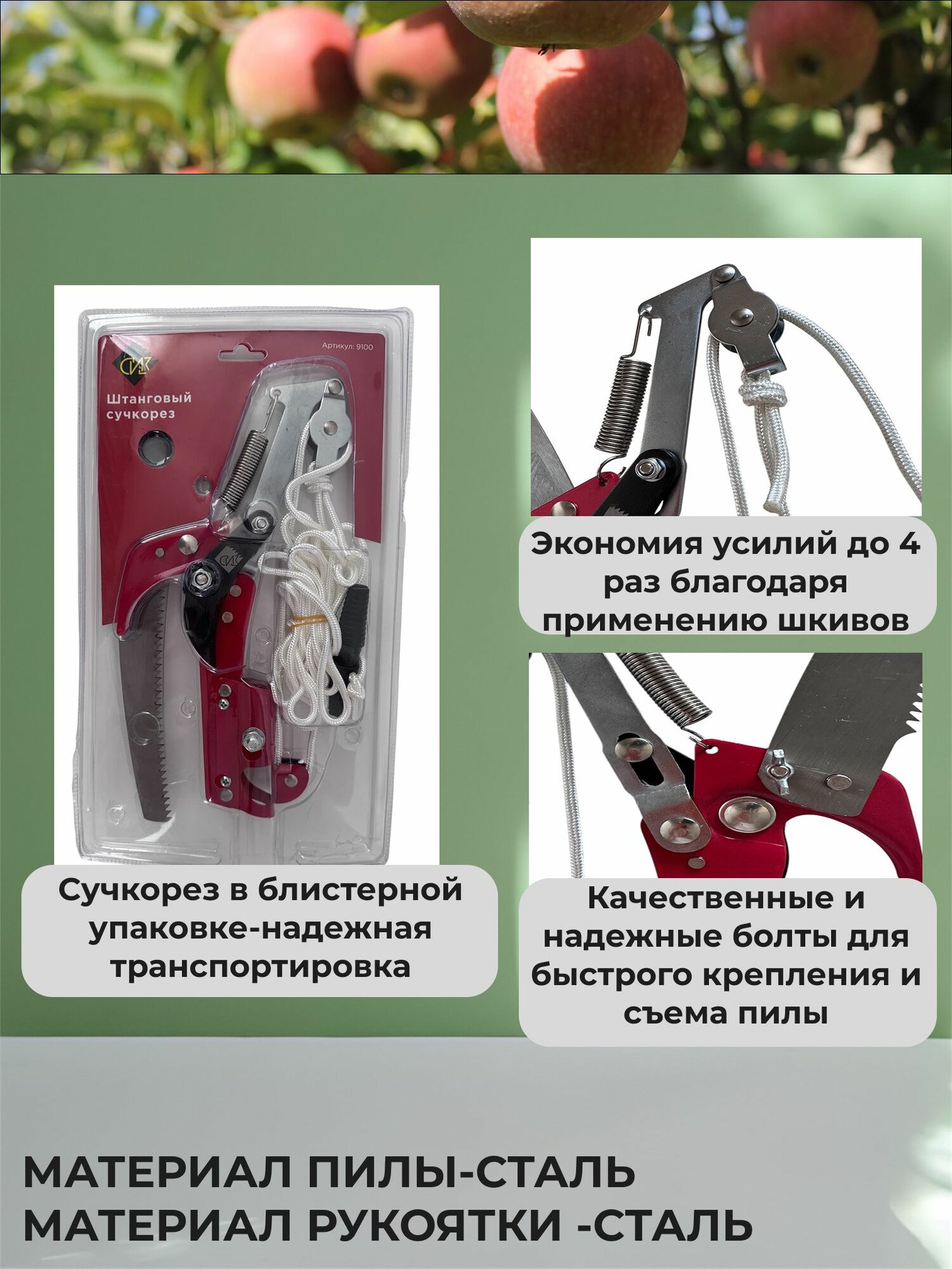 - Удобная конструкция с пилой и шнуром обеспечивает быстрое и аккуратное удаление веток любой высоты