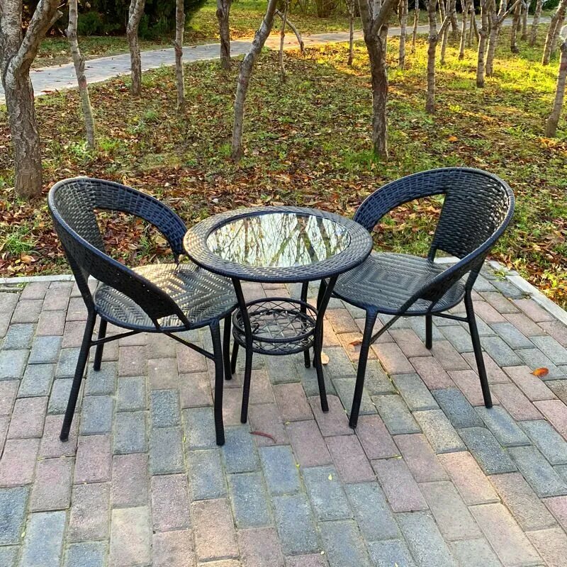 Садовый стол из закаленного стекла станет стильным и практичным дополнением вашего сада. Благодаря круглой форме столешницы и черной цветовой гамме, он легко впишется в любой ландшафтный дизайн.