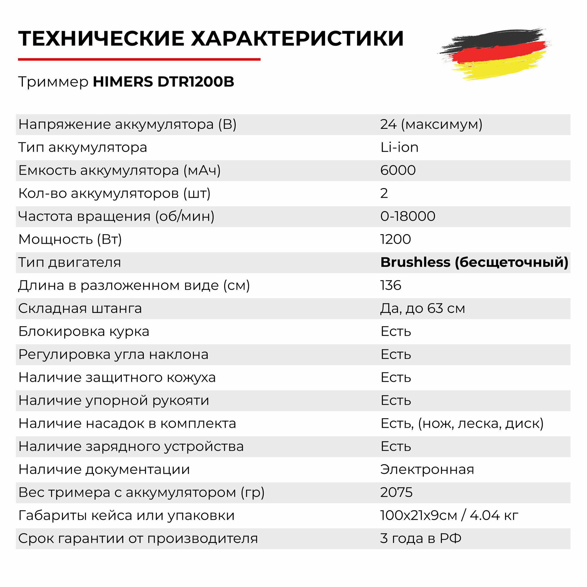 Садовый триммер HIMERS DTR1200B аккумуляторный 24V, 2 АКБ по 6 А. ч, 1200вт, 18000 об/мин: сравнение цен, характеристики, фото, актуальное наличие и цены.