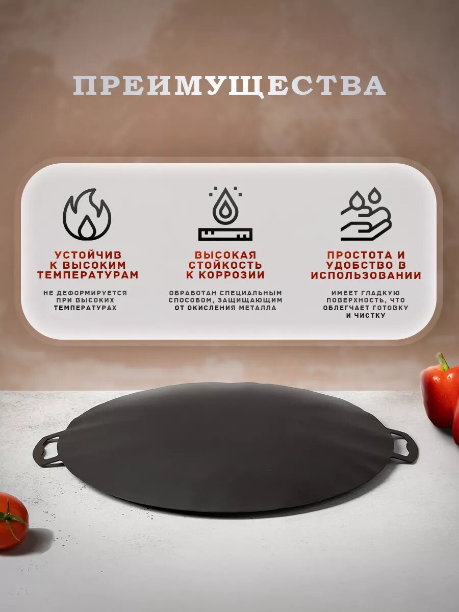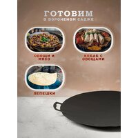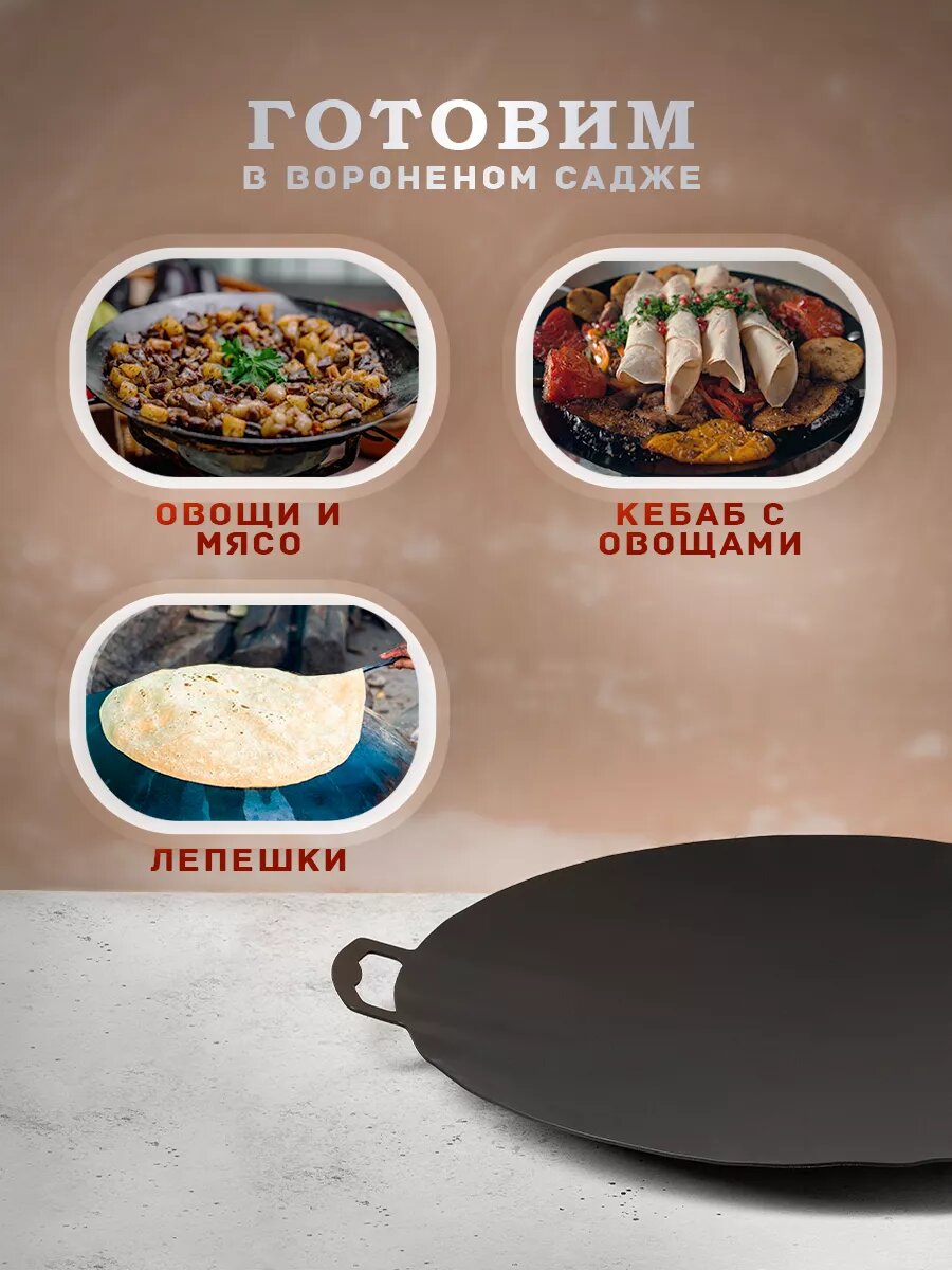 Сковорода-Садж из вороненой стали. Можно применять в домашних условиях и на природе. Не деформируется под воздействием высокой температуры. На Садже Вы можете готовить непосредственно на мангале или использовать их для красивой подачи на стол и поддержания температуры уже готового блюда. После приготовления пищи не требует специального ухода, достаточно просто помыть теплой водой. Продолжительный срок эксплуатации за счет того, что сталь вороненая - защищенная от ржавчины.