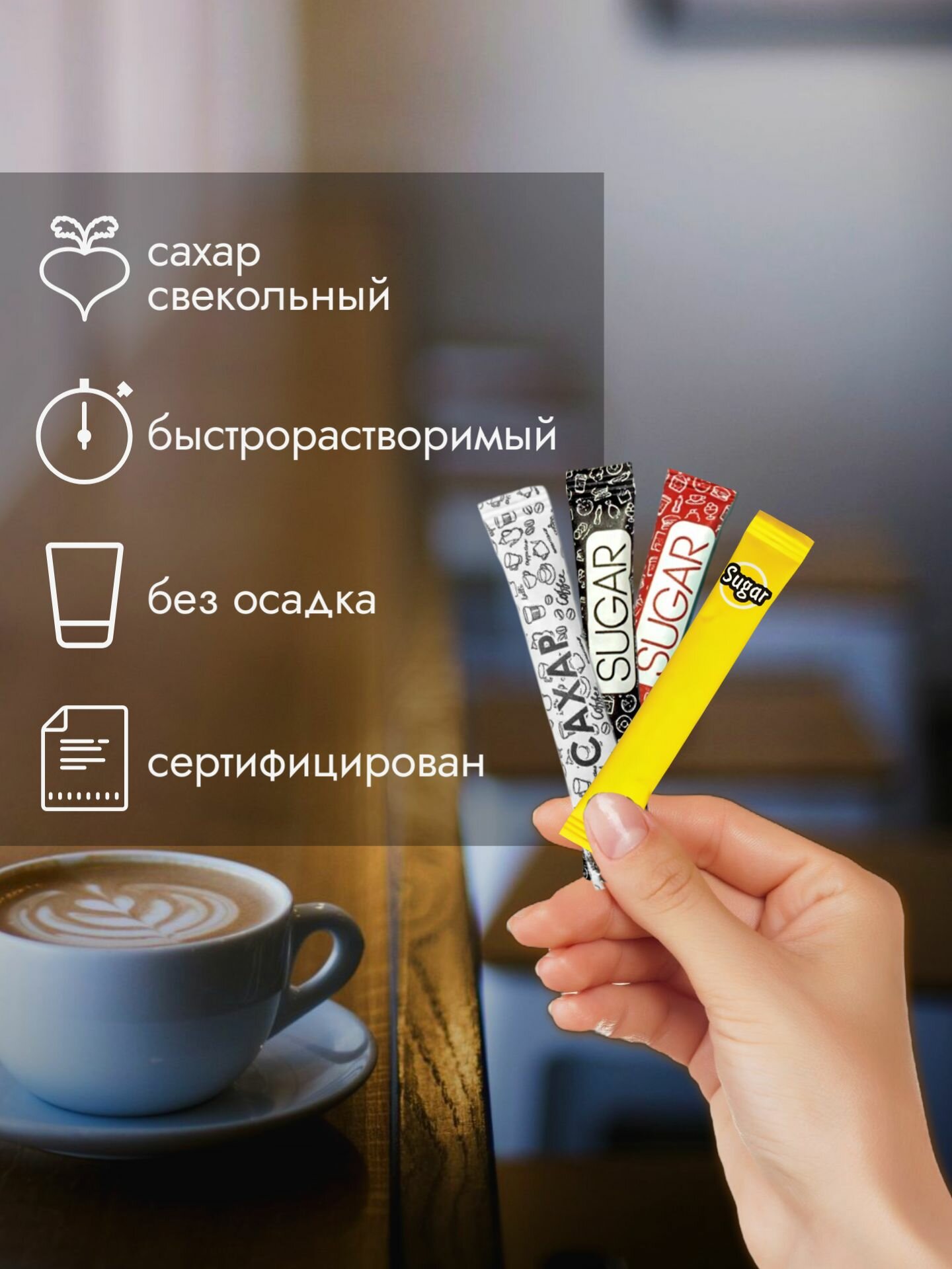 Микс из 4 различных дизайнов. Белый сахар в бумажных стиках, порционный, по 5 грамм, экстра качества - имеется декларация соответствия. Так как мы сами являемся производителями, то вы покупаете товар напрямую, без посредников, по хорошей цене, без потери качества и экономии на упаковке. В индивидуальной упаковке и граммовка равна одной чайной ложке.
