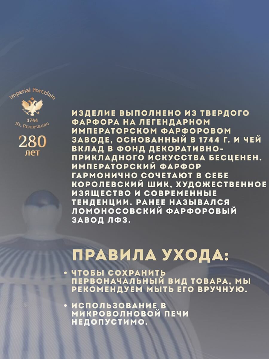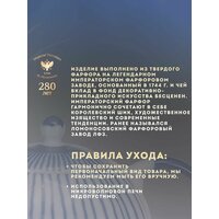 • Обратите внимание, Императорский фарфоровый завод выпускает изделия согласно требованиям ГОСТ, допускающим наличие наколов, черных точек и вкраплений до 1 мм на изделиях, в т. ч. на лицевой стороне. Это не является браком.
