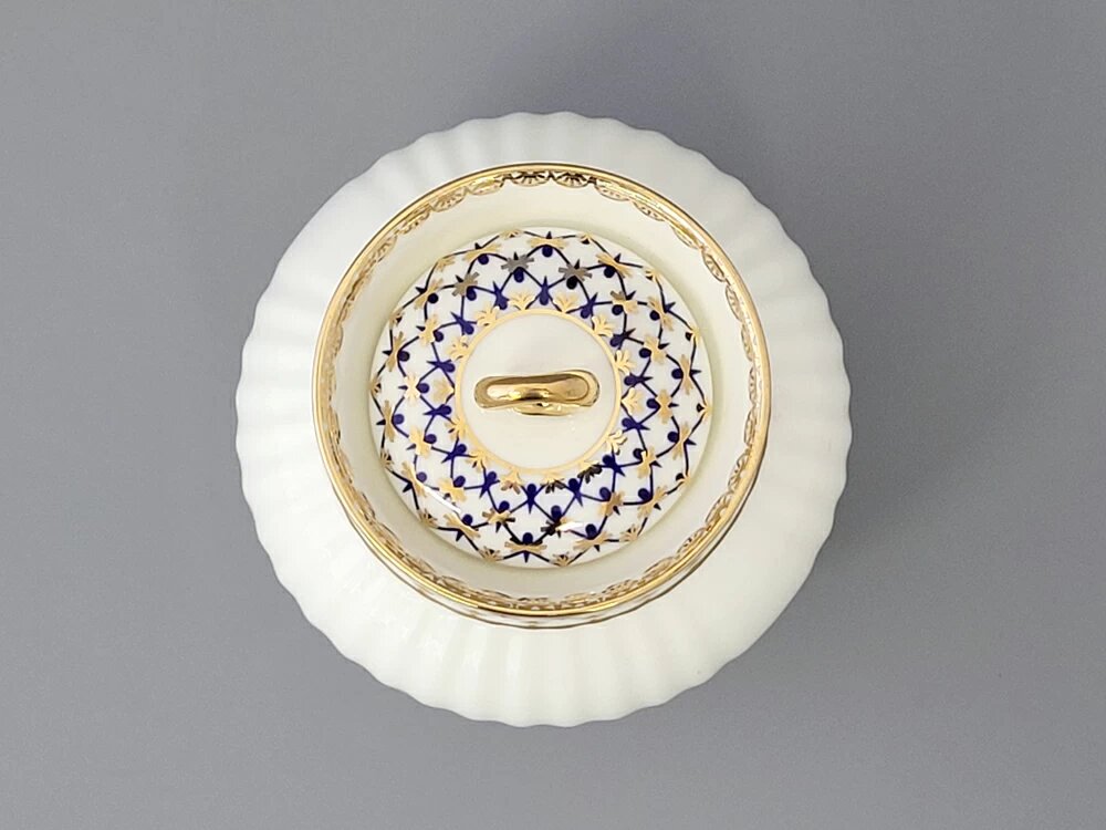 Сахарница Кобальтовая сетка ; Форма: Весенняя; Изделие изготовлено из материала: Твердый фарфор; Высота: 120 мм; Объем: 400 мл; Автор формы: Яковлева Серафима Евгеньевна; Автор росписи: Яцкевич Анна Адамовна; Производитель: Императорский фарфоровый завод (ИФЗ, ЛФЗ), Россия;