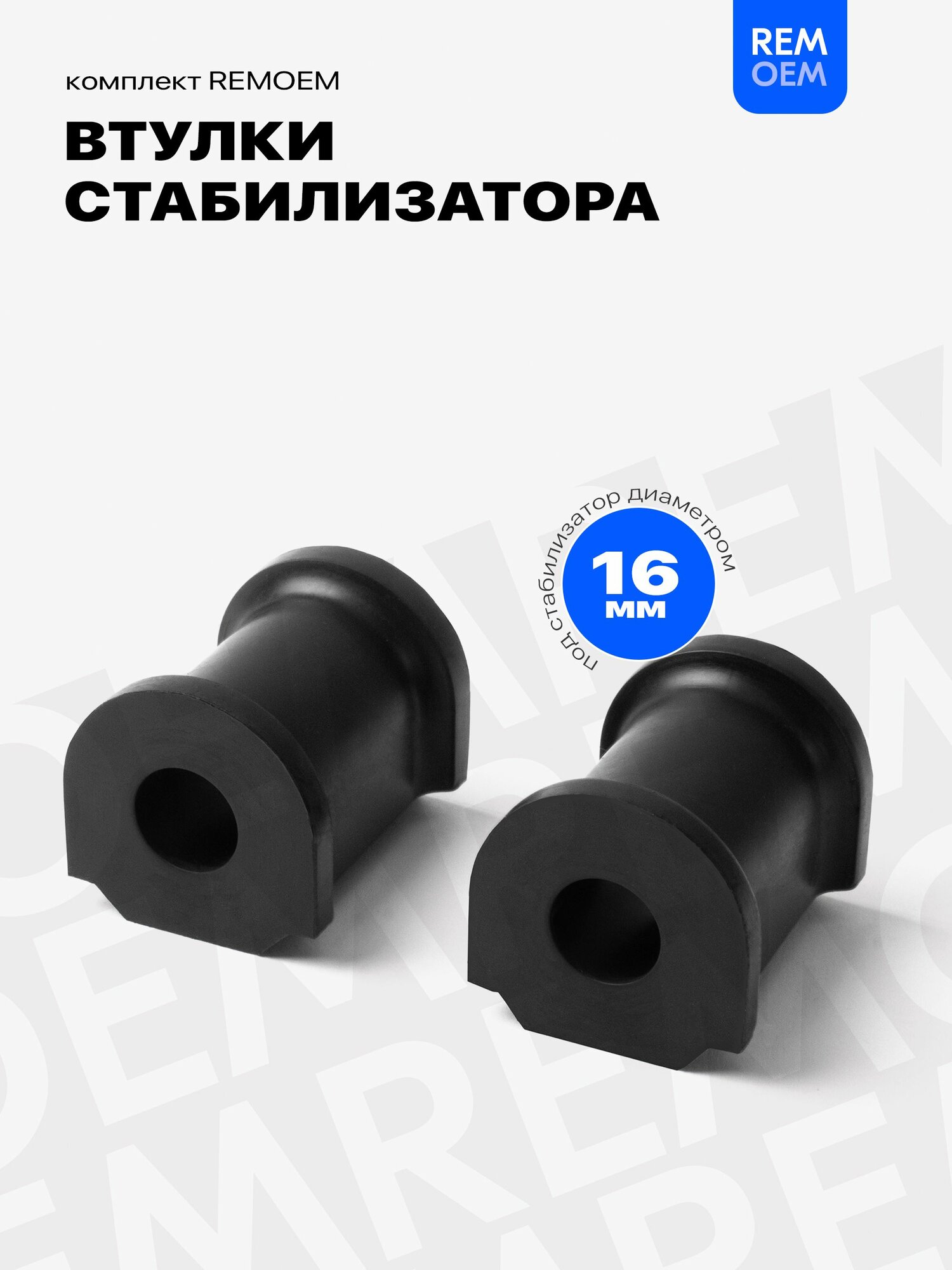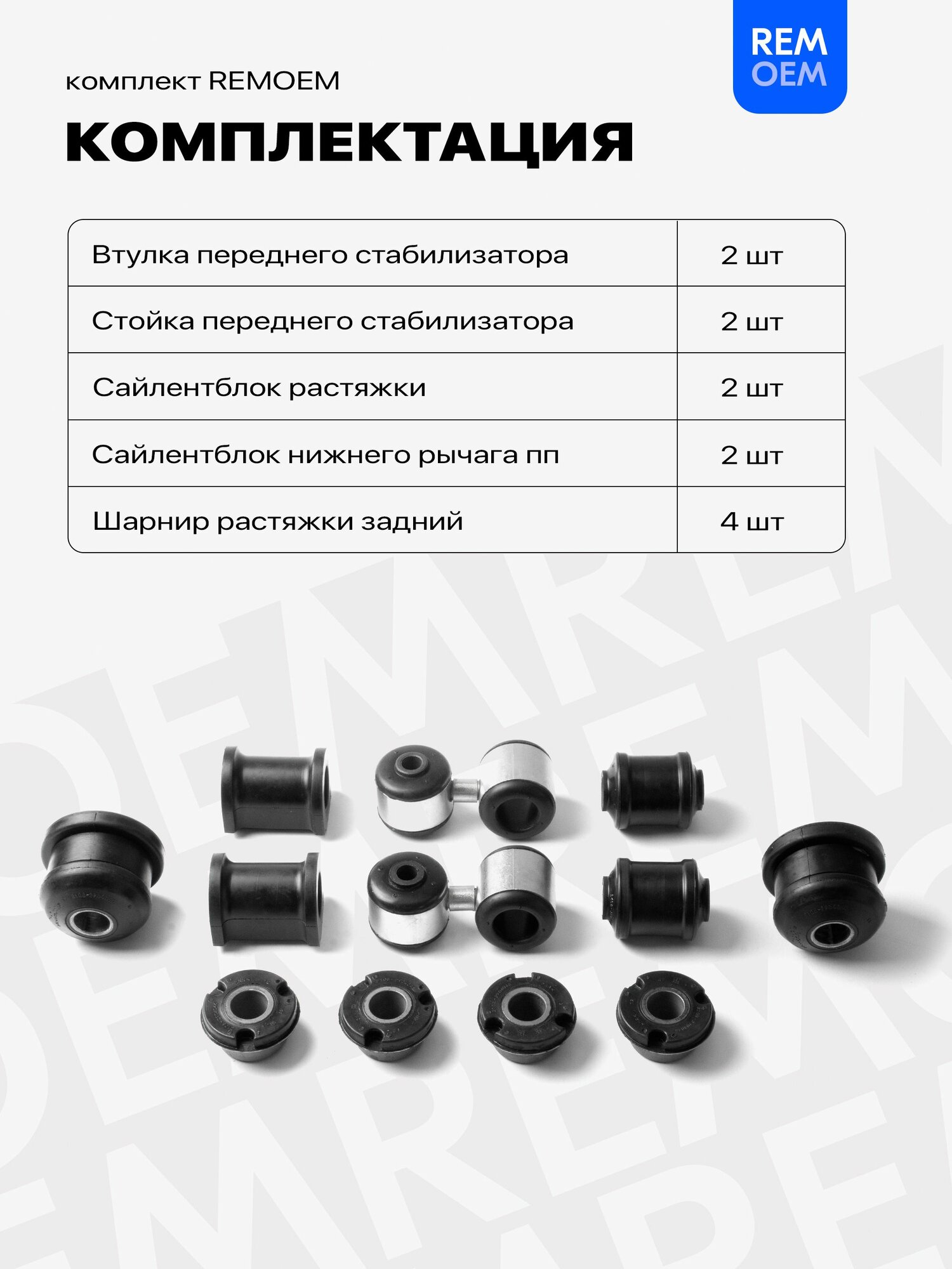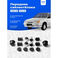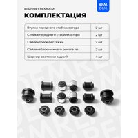 Ремкомплект передней подвески для а/м ВАЗ 2108, 2109, 2113, 2114, 2115 от производителя Remoem. Комплект состоит из 12 элементов подвески: стойки стабилизатора, втулки стабилизатора, втулки кронштейна, втулки рычага и шарниры растяжки. Втулки и стойки рассчитаны под стабилизатор диаметром 16 mm. Все резинотехнические изделия в данном комплекте производятся по современным стандартам госта в городе Балаково. В процессе изготовления резиновых смесей применяется самое качественное сырье и современное оборудование. После замены всех комплектующих комплекта будет заметна плавность при езде по неровной дороге, значительное уменьшение стуков и вибраций в автомобиле. С данным комплектом образуется комплексное решение, так как все оригинальные элементы подвески в одном комплекте, экономится время и деньги. Все элементы разработаны для легкой и быстрой установки, полностью соответствуют заводским характеристикам. Важно, при выборе, правильно подобрать комплект сайлентблоков к стабилизатору автомобиля, так как они различаются диаметром отверстия (16mm, 18mm, 20mm, 22mm).