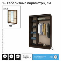 он сделан из ЛДСП высокого качества в комбинации цветов венге и лоредо, раздвижные дверцы декорированы темными полосами и дополнены удобными ручками, центральная створка – полностью зеркальная, внутри модель содержит все необходимые зоны для хранения одежды и обуви: большое отделение для плечиков, а также полки и ниши для остальных вещей. Правильный выбор по лучшей цене — это шкаф-купе Сакура 1,5 м.