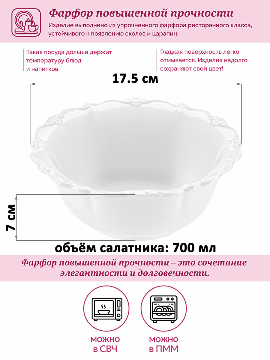 | Дополнительная информация | Салатник "Галант" 17,5х17,5х7 см 700 мл, волнистый край, фарфор |