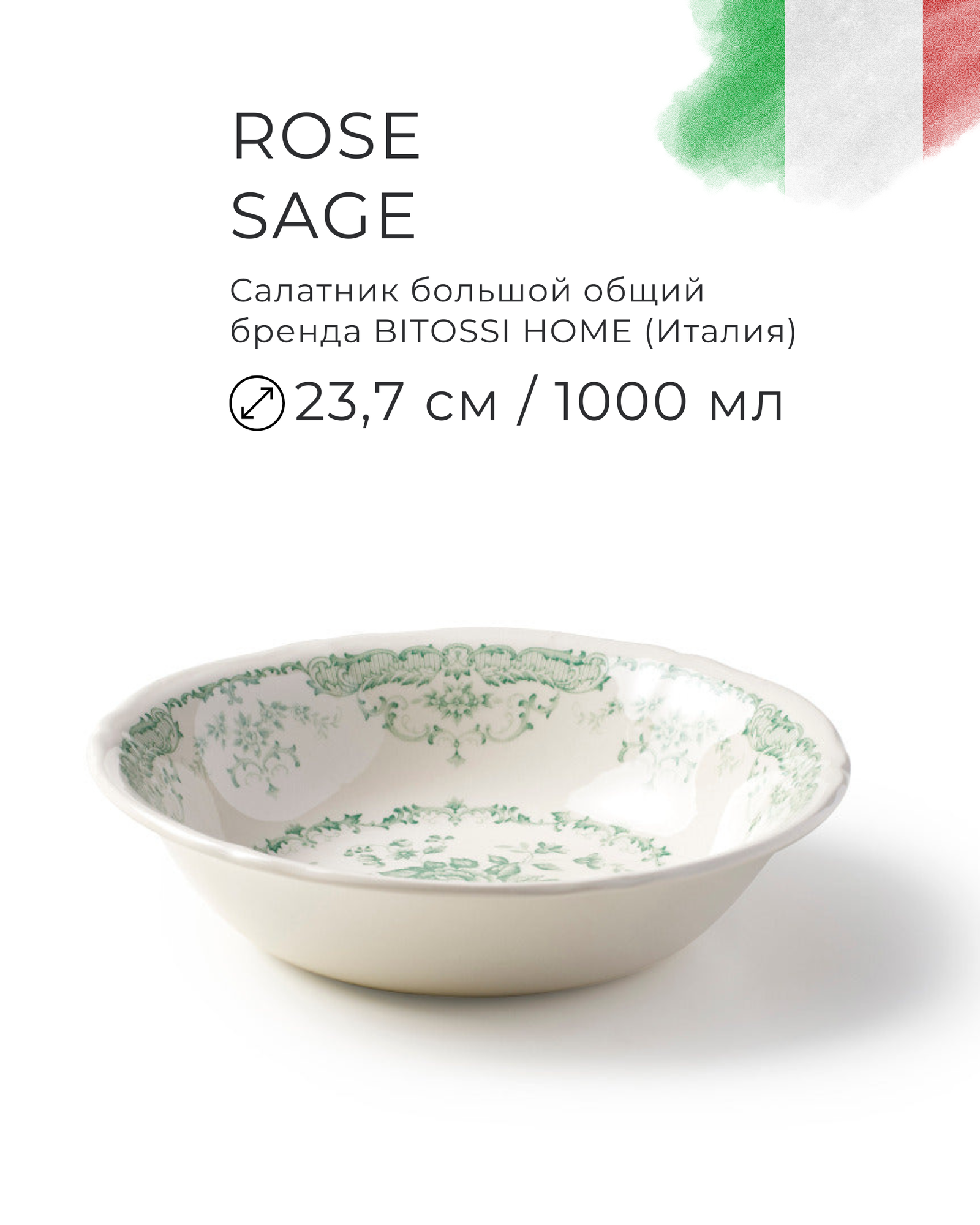 Материал: прочная керамика (ironstone) Диаметр: 23,7 см Бренд: Bitossi HOME Серия: Rose Страна производства: Италия Гарантия на сколы и трещины: нет Цвет: шалфей