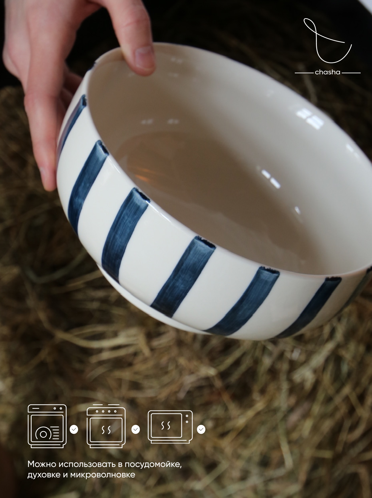 Преимущества: Большой объём – 1750 мл, Позволяет подавать полноценные салаты, фрукты и гарниры для всей семьи. Прочная керамика: материал устойчив к сколам и высоким температурам, дольше сохраняет температуру блюда и не впитывает запахи. Глазурованная поверхность: лёгкая очистка и яркость рисунка даже при ежедневном использовании. Подходит для микроволновки и посудомоечной машины. Приятно экономит время и усилия при уходе. Сине‑белые полосы вписываются в интерьеры в стиле Zara Home, сканди‑минимализм и средиземноморский декор, добавляя акцент на сервировку.