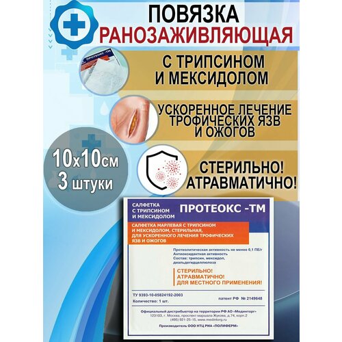 Салфетка заживляющая Протеокс-ТМ представляют собой тонкое раневое покрытие, пропитанное трипсином и мексидолом. Ранозаживляющая салфетка предназначена для лечения трофических язв, всех стадий пролежней и гнойных ран. Под покрытием рана эффективно и быстро очищается от гноя и некротических тканей, воспалительный процесс проходит. Действующие вещества стимулируют скорое заживление. Показания к применению:- гнойно-воспалительные процессы в мягких тканях;- пролежни 1-4 стадии;- трофические, венозные и диабетические язвы;- флегмона. Салфетки Протеокс-ТМ показаны для лечения инфицированных ран и пролежней на любой стадии. Эффективно очищают раневую поверхность, снимают воспаление, ускоряют заживление. Протеокс-ТМ обладает раноочищающей протеолитической активностью не менее 0,1 ПЕ/г, проявляющейся при гидролитической деструкции материала в период контакта с влажной раневой поверхностью. Сополимер вносит в раневую среду наночастицы, являющиеся фрагментами модифицированной целлюлозы с иммобилизованным трипсином, который растворяет некротизированные белковые массы и очищает поверхность раны. Мексидол обеспечивает антиоксидантное действие и способствует клеточному дыханию. В процессе действия на раневой поверхности образуется тонкая гелевая пленка, не позволяющая повязке прилипнуть к ране.