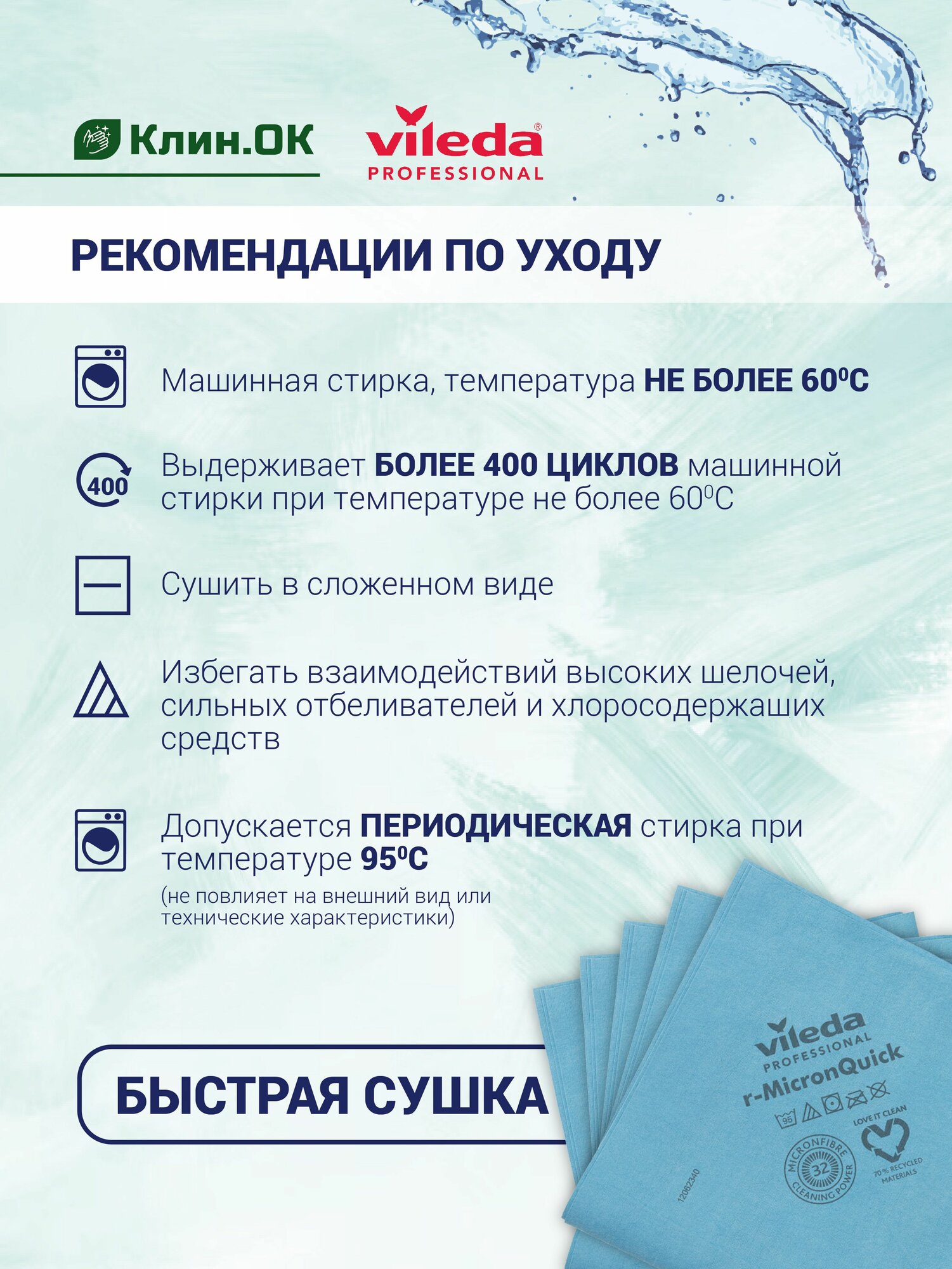 Убирает без разводов и ворса, за счет чего повышается скорость уборки, так как поверхности протираются за 1 раз; - моющие способности на 15 % выше предыдущего поколения микроволокна;