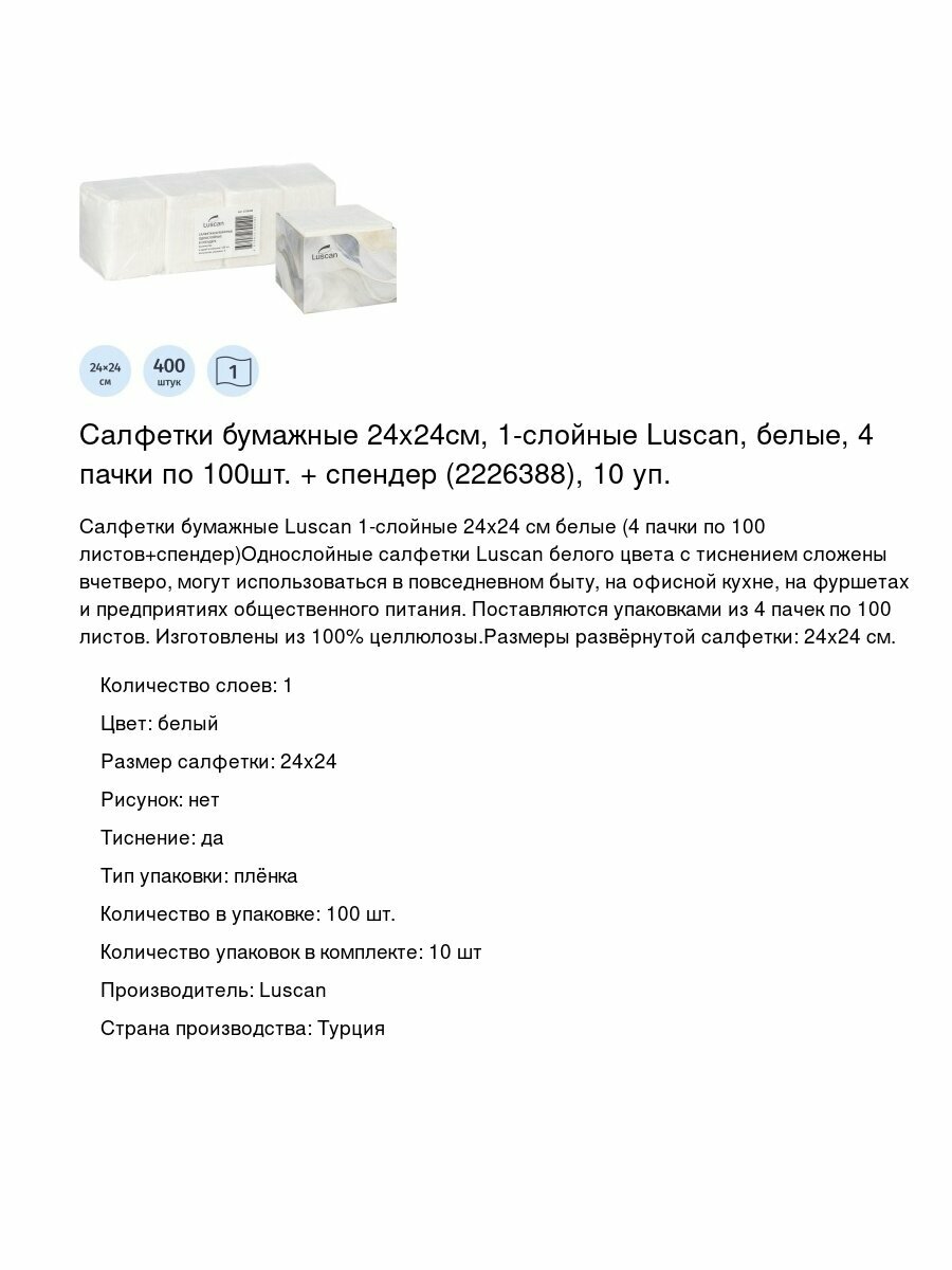 Салфетки бумажные 24x24см, 1-слойные Luscan, белые, 4 пачки по 100шт. + спендер (2226388), 10 уп.