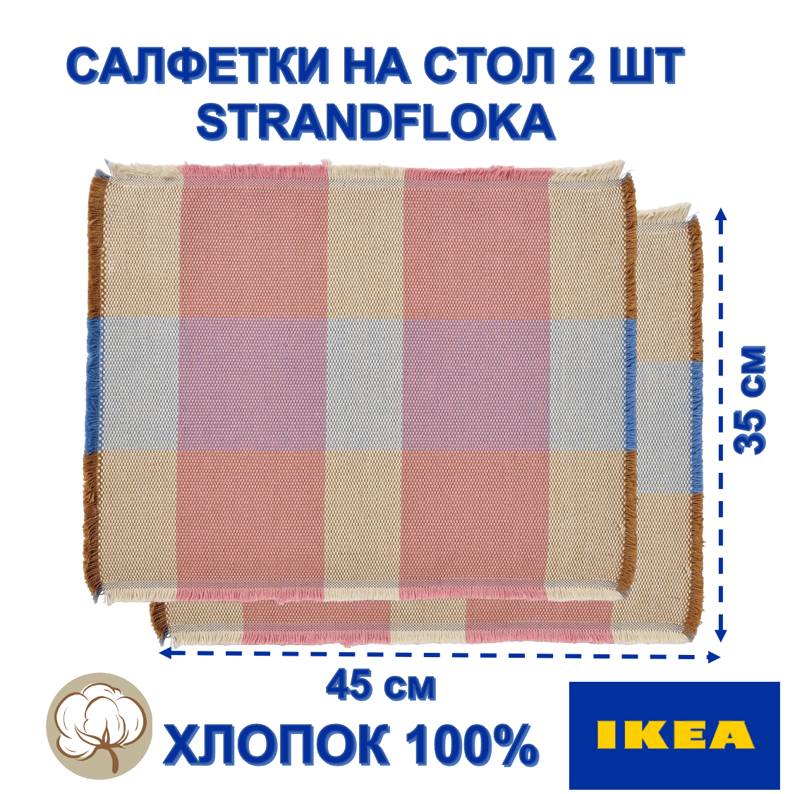 Набор салфеток икеа STRANDFLOKA - это стильный и практичный аксессуар для сервировки стола. В комплект входят две салфетки размером 45x35 см каждая, выполненные из 100% хлопка.