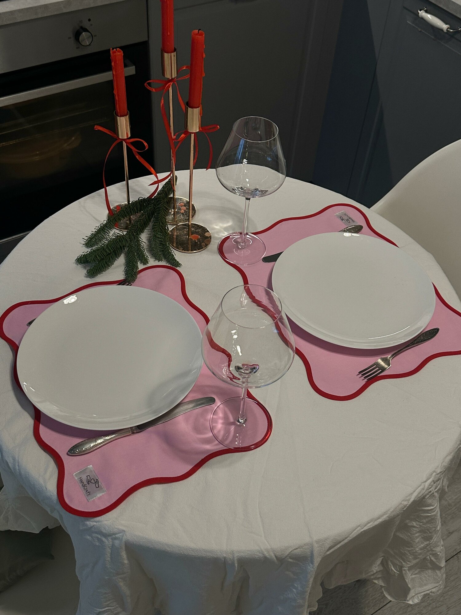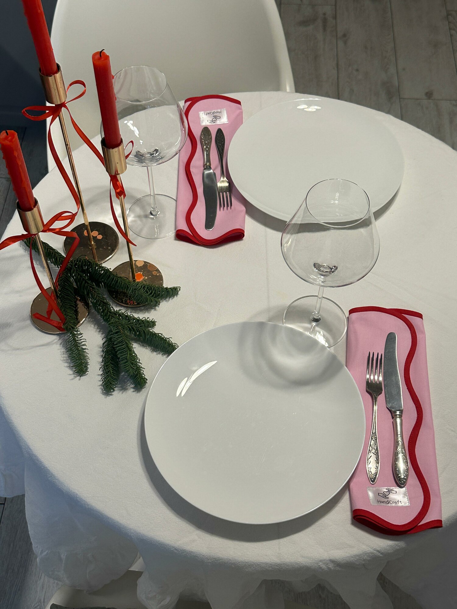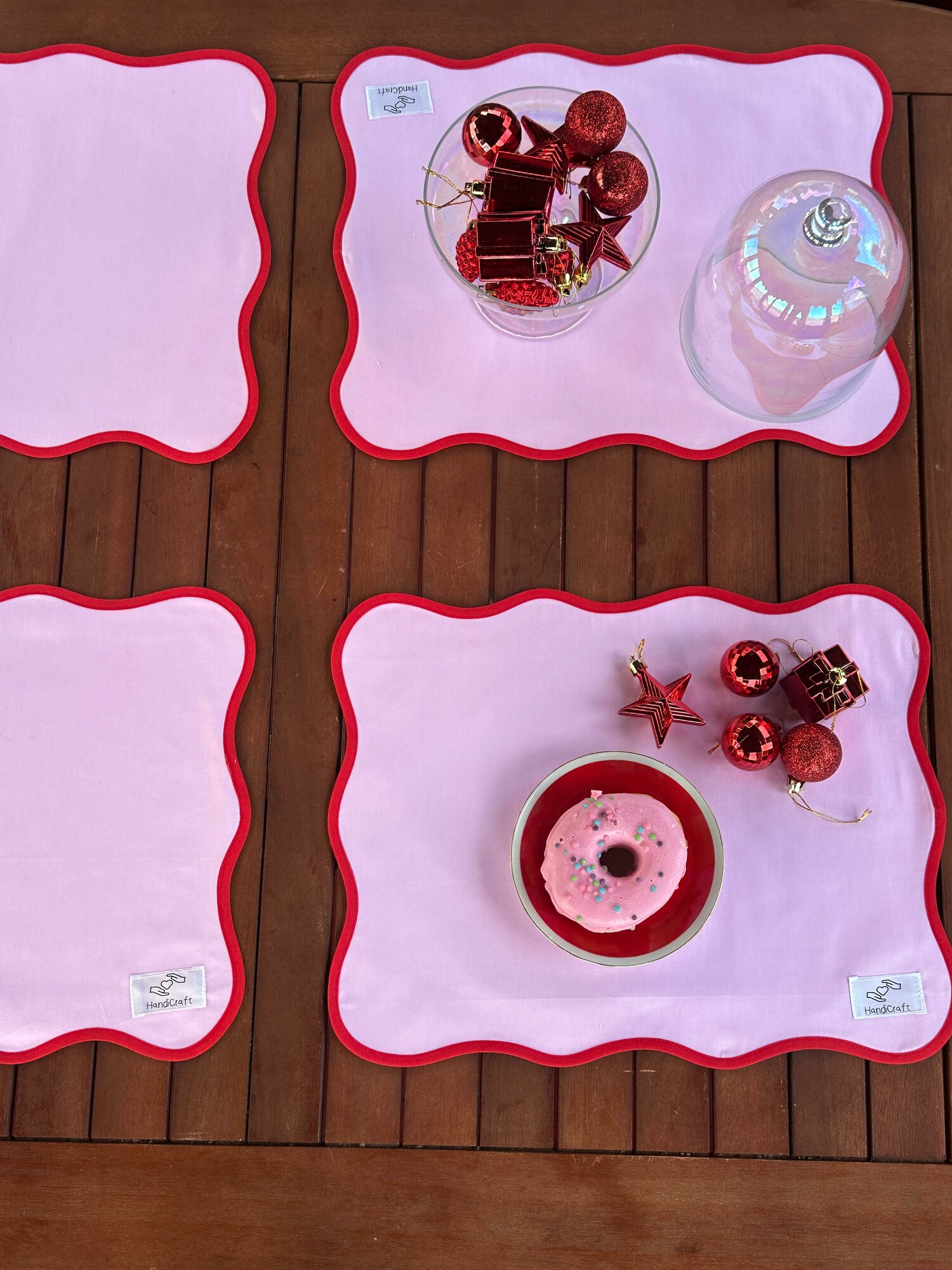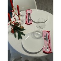 Красная бейка подчеркивает волнистые края салфеток и делает их еще более привлекательными. Это добавляет акцент на детали и делает салфетки еще более заметными на столе.