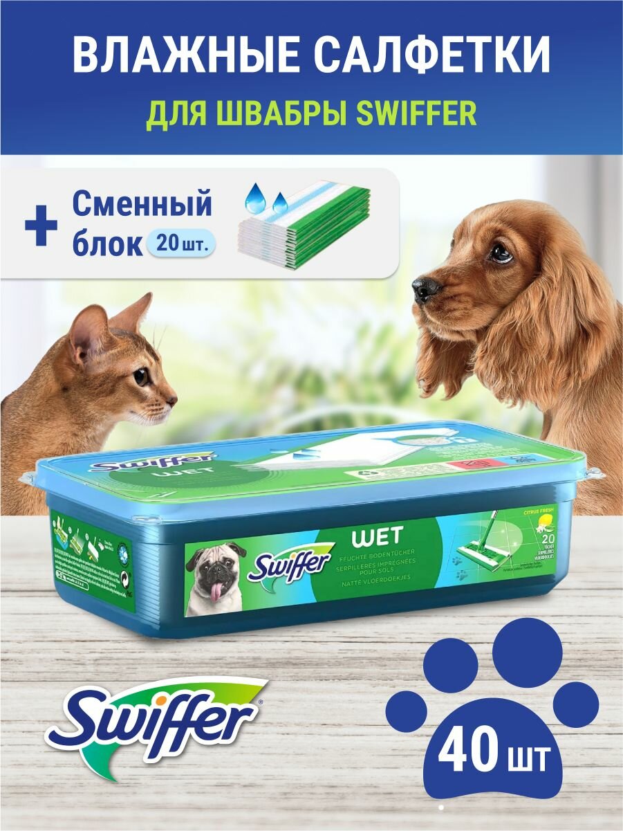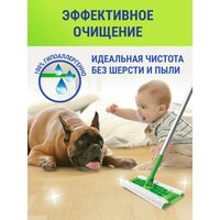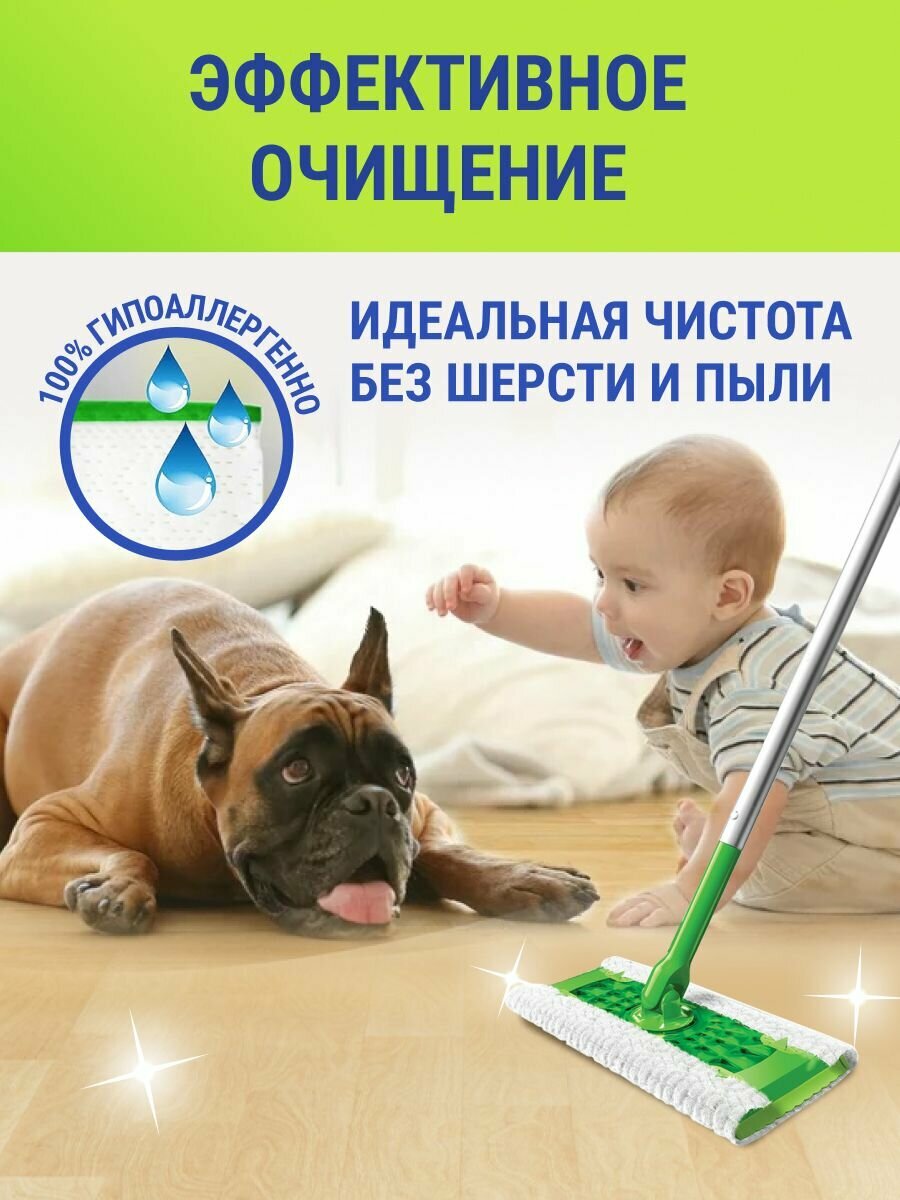 Просто прикрепите влажную одноразовую салфетку Swiffer к швабре, чтобы быстро и безопасно убрать повседневную грязь, без ополаскивания. Никогда еще мытье пола не было таким простым и удобным. Салфетка пропитана особым средством, которое абсолютно безопасно для детей и домашних животных, при этом оставляет запах свежести. Притягивает и задерживает грязь лучше, чем любая тряпка с водой. Уникальная формула улавливает и блокирует пыль, загрязнения, волосы и шерсть домашних животных глубоко в ткани.