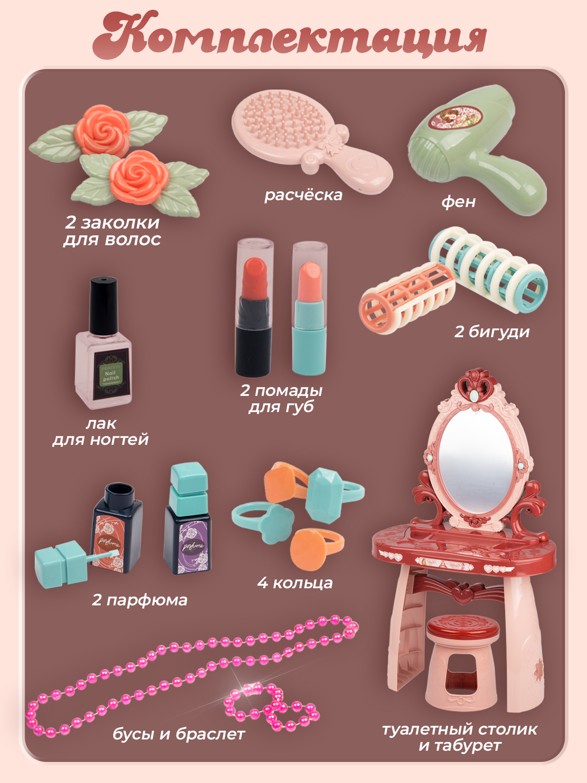 Трюмо для девочки подойдёт в качестве подарка на день рождения, Новый год, 8 марта. Это не просто игрушка — это целый мир сюжетных игр. Девочка может укладывать волосы, играть «в салон», «краситься» как мама.