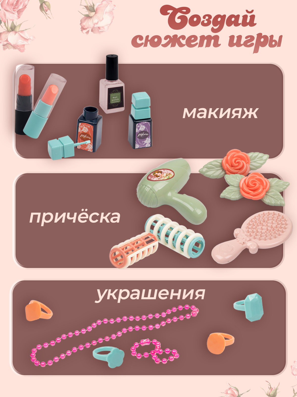 Салон красоты детский подойдёт тем, кто любит играть в парикмахерскую, создавать яркие образы и повторять за мамой бьюти-ритуалы. В комплекте — 17 предметов: игрушечная косметика, заколки, фен, украшения, расчёска и многое другое.