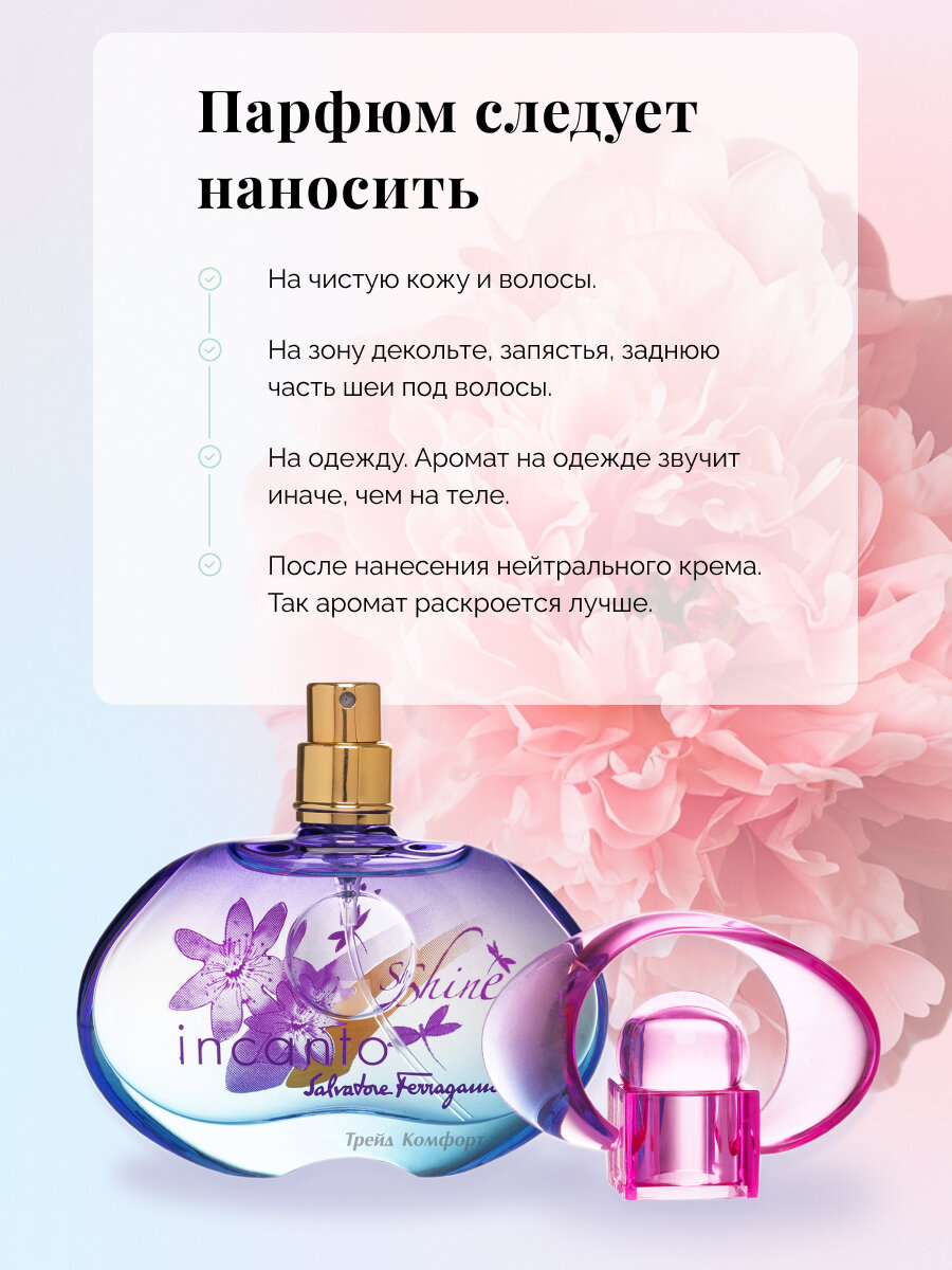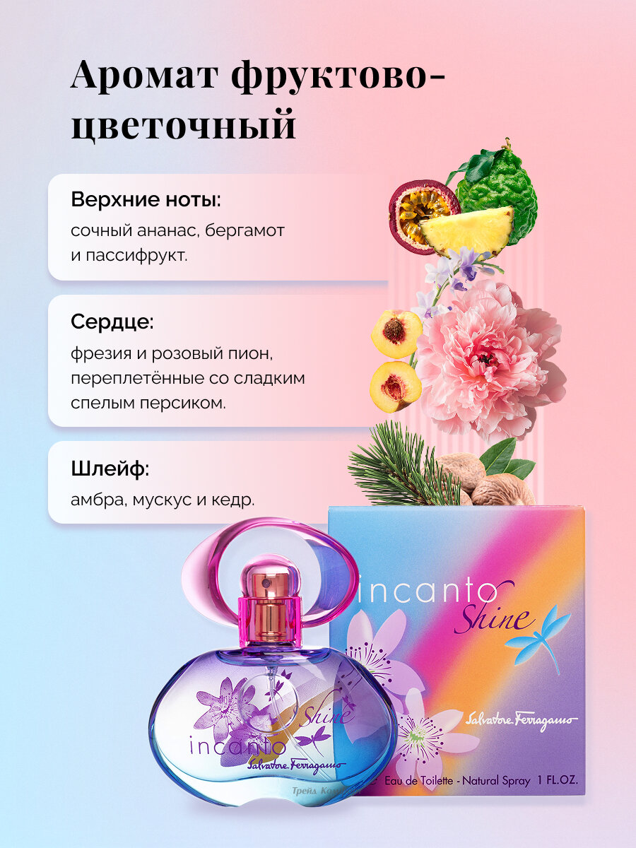 Фруктово-цветочный женский аромат известного итальянского бренда Salvatore Ferragamo был создан в 2007 году французским парфюмером Karine Dubreuil-Sereni и стал одним из самых популярных ароматов бренда, завоевав сердца многих женщин по всему миру. Композиция открывается аккордами сочного ананаса, бергамота и пассифрукта, которые придают аромату легкость и играют роль первого впечатления. Эта завораживающая смесь плавно переходит в сердце, где благоухает фрезия и розовый пион, переплетенные со сладкими нотами спелого персика, добавляя композиции женственности, элегантности и романтичности. Завершается композиция окутывающим и сладостным шлейфом из нот амбры, мускуса и кедра, придавая парфюму глубину, стойкость и теплоту. Incanto Shine имеет среднюю стойкость, его аромат сохраняется в течение нескольких часов после нанесения. Он идеально подходит для повседневного использования в дневное время. Это отличный выбор для жаркого летнего времени года благодаря его фруктовым акцентам, которые добавят прохлады вашему образу.