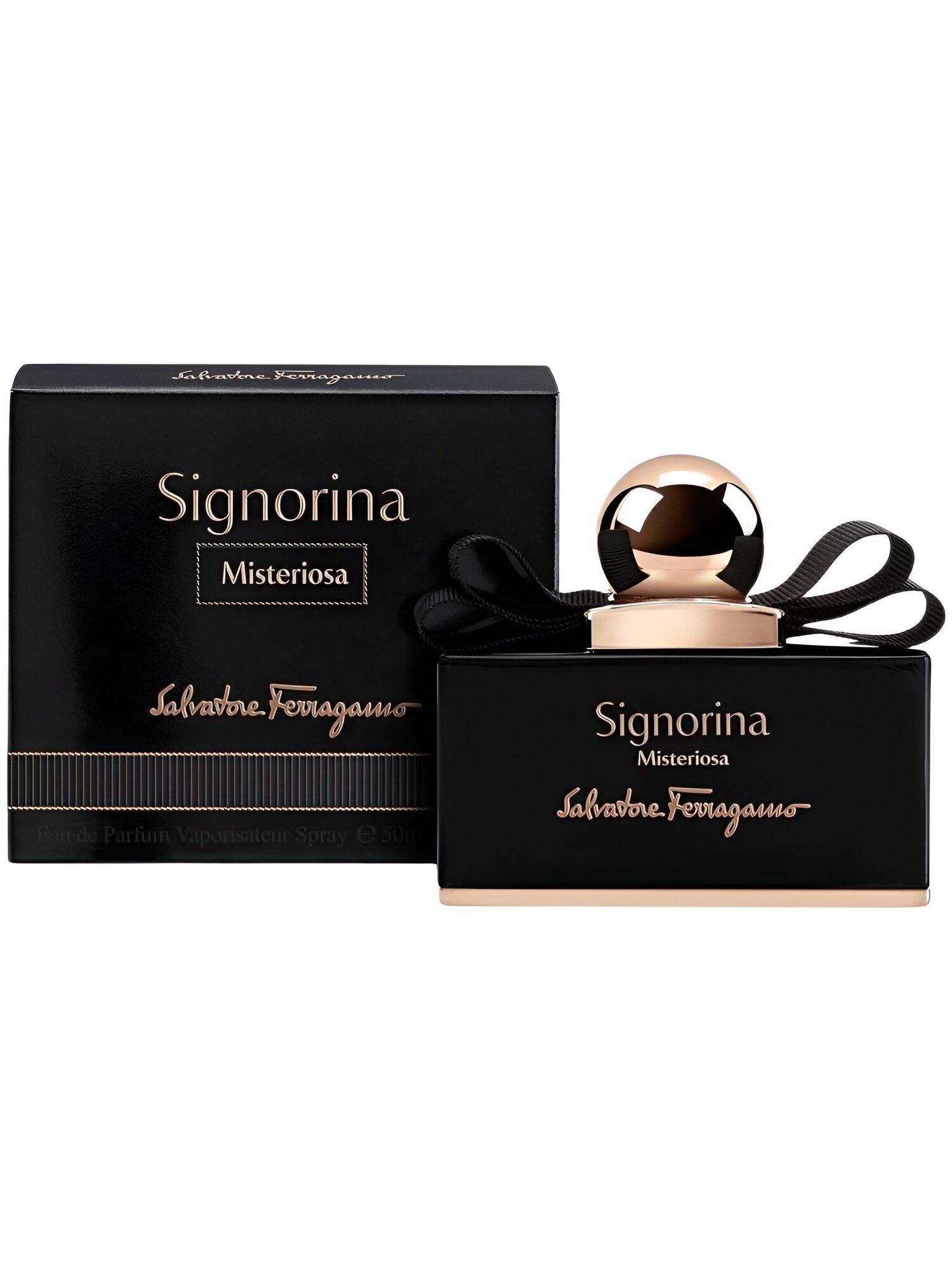 Salvatore Ferragamo Signorina Misteriosa – женский восхитительный вечерний аромат, который представляет собой переизданную в 2015 году композицию. Парфюм привлекает внимание своим необычным букетом, способным навсегда покорить обладательницу. Над созданием новой композиции работали парфюмеры Николас Болье и Софи Лаб. В Salvatore Ferragamo Signorina Misteriosa хорошо различимы чуть резковатые обворожительные нюансы ежевики, которые смешиваясь с нероли, оставляют бархатистый шлейф. Затем аромат следует дальше, где уже звучат восхитительные аккорды флердоранжа и туберозы, уступающие место пачули и черной ванили, которые с достоинством завершают данную композицию. Аромат Salvatore Ferragamo Signorina Misteriosa представлен в роскошном флаконе черного цвета, верхняя часть которого декорирована серебристым бантом и круглым золотистым колпачком. Signorina Misteriosa выпущен в 2016 году. Signorina Misteriosa был создан Sophie Labbe, Nicolas Beaulieu и Juliette Karagueuzoglou. Верхние ноты: Ежевика и Нероли; средние ноты: Тубероза и Цветок апельсина; базовые ноты: Молочный мусс, Черная ваниль и Пачули.