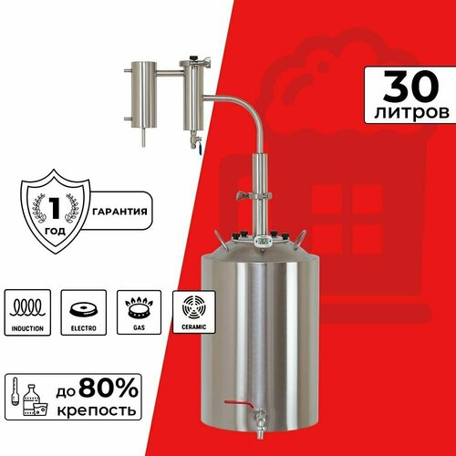 Самогонный аппарат Германия люкс с объемом бака 30 л выполнен из пищевой нержавеющей стали, подходит для всех типов плит, в том числе индукционных. Высота аппарата в сборе 1050 см. Производительность дистиллятора до 4 литров в час.