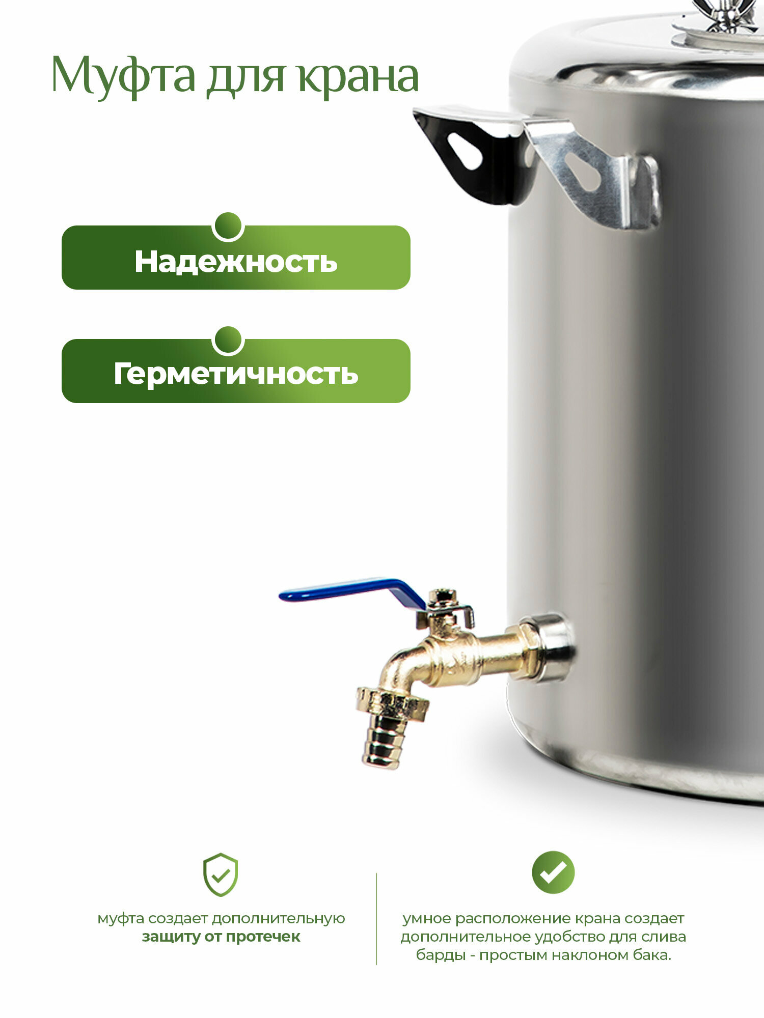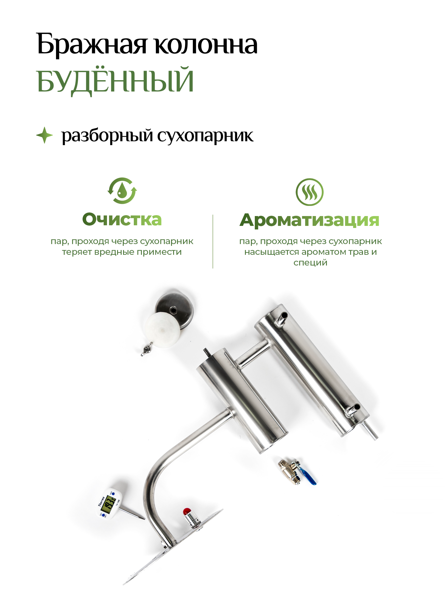| Подробная комплектация | барашки из нержавеющей стали - 6 шт; перегонный куб с силиконовой прокладкой; предохранительный клапан и цифровой термометр; холодильник, разборный сухопарник, гермоввод; ПОДАРОК Шланг ПВХ- 4 м. |
