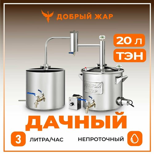 | Дополнительная информация | Один разборный сухопарник с отверстием для слива сивушных масел отвечает за: дополнительную очистку продукта ароматизацию напитка душистыми травами, корками цитрусовых, сухофруктами и любыми ингредиентами на свой вкус. Для того, чтобы насытить напиток вкусовыми и ароматическими свойствами достаточно просто положить внутрь емкости любой из компонентов, которые вам нравятся. Так вы получите уникальный авторский напиток, который порадует вас и ваших близких. С ним вы можете производить дистилляцию, где угодно: на даче, природе или в гараже. «Дачный» оснащен классическим непроточным холодильником и успешно работает на костре и без доступа к водопроводу. А ферромагнитное дно позволяет использовать перегонный куб на любой нагревательной поверхности: электрической, стеклокерамической, газовой и индукционной. Многофункциональная крышка оборудована клапаном сброса избыточного давления, возникающего в случае неправильной эксплуатации самогонного аппарата. Кламповое соединение диаметром в 2 дюйма предназначено для расширения базовой комплектации аппарата. Крышка надежна крепится на перегонном кубе при помощи герметичного зажимного хомута, не позволяющего лишним запахам выбраться наружу. Приобретая модель в сборке с электрическим ТЭНом и регулятором мощности, вы можете проводить дистилляцию, установив её прямо на пол, что является существенным плюсом для тех, кто не может поставить устройство на плиту, поскольку этому мешает вытяжка. |