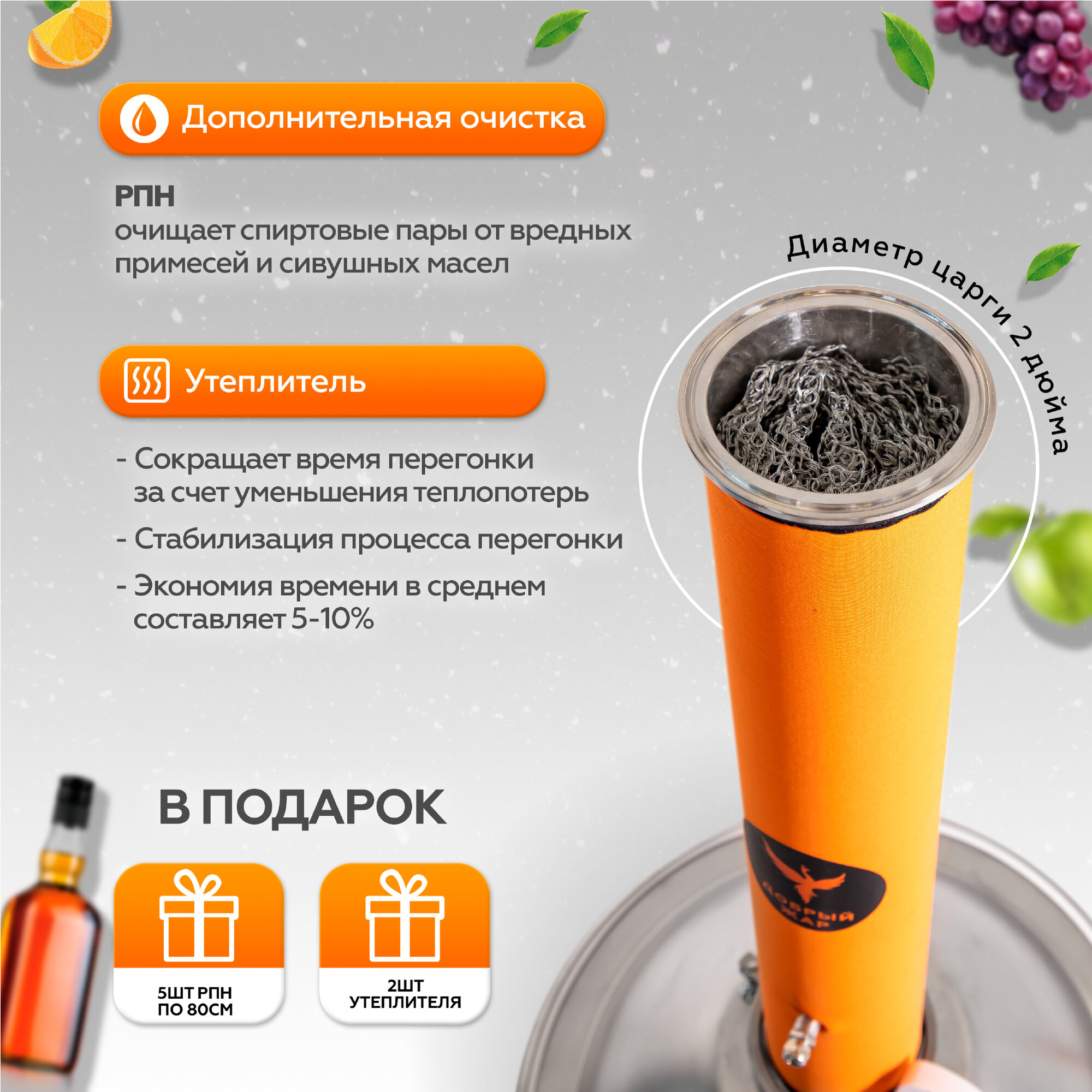 Длина царги – 50 см. Это оптимальная длина паропровода для получения крепкого, чистого продукта. Внутри царги можно расположить до пяти регулярных проволочных насадок Панченкова (3 штуки идут в комплекте), которые способствуют дополнительной очистке дистиллята. Для ректификации можно установить дополнительную царгу длинной 35, 50 и 70 см.