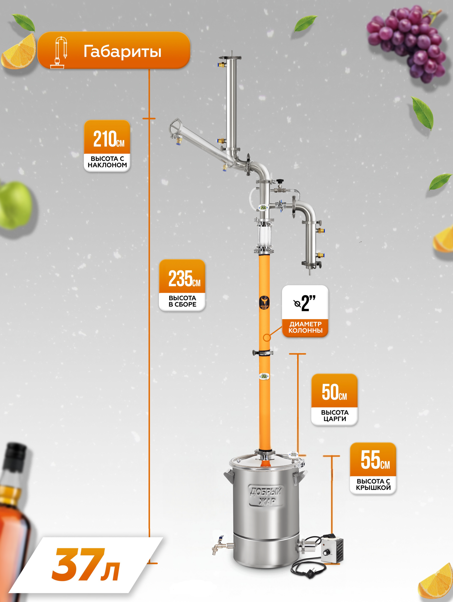 Дистиллятор оснащен клапаном сброса давления. Конусовидная крышка дает дополнительную площадь для осаживания тяжелых испарений с большим количеством примесей, а также предотвращает попадание пены в колонну, благодаря чему вы получаете чистейший и ароматный домашний напиток.