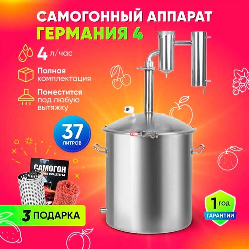 Германия 4 на 37 л – отличный подарок на Новый год, День рождения, 23 февраля, 8 марта для папы, брата, дедушки, друга, женщин и мужчин. Это лучший дистиллятор для домашнего самогоноварения среди самогонников Первачок Домспирт Русич Добрый жар Бахус Феникс Магарыныч Абсолют и других.