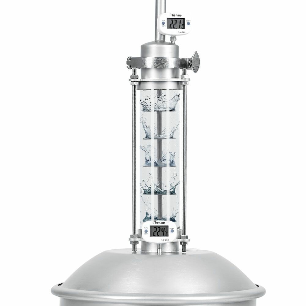 Самогонный аппарат Organic 2 NEW (Органик 2 НЬЮ) это: Уникальная стеклянная царга Контролируйте процесс. Получайте вкусные и чистые напитки с первой перегонки. Вместо привычной стальной колонны в Organiс стоит уникальная стеклянная царга. С ней перегонка как на ладони. Вы не пропустите захлёб или брызгоунос. А ещё — сможете с удовольствием любоваться барботажем. Без брызгоуноса Без захлёба колонны С шикарным видом на барботаж Прочное боросиликатное стекло легко переносит нагрев до 180 °C. Оно не боится перепадов температуры и не разобьётся при случайном падении. Запатентованные чешуйчатые тарелки Полноценная замена дорогим колпачковым колоннам! Внутри царги — 6 чешуйчатых тарелок, через которые пар проходит волнами — от края нижней к другому краю верхней. Так он задерживается внутри, поэтому на 32% эффективнее орошается флегмой, в сравнении с обычными тарелками. Это именно наша разработка, которую не встретить в царгах других аппаратов. 6 особых чешуйчатых тарелок На 32% крепче и чище напитки На поверхность тарелок можно выложить фрукты, ароматные травы и очищающие насадки. Пар пройдёт через них, и уже с первой перегонкой вы получите вкусный и чистый домашний напиток. Идеальный результат уже с первой перегонки Мощный спиральный холодильник Холодный и чистый продукт — на 23% быстрее и эффективнее. Холодильник аппарата использует продвинутую систему охлаждения: в нём 5 закрученных спиралью трубок, которые оставляют далеко позади аппараты с рубашечной системой и змеевиком. 5 суперэффективных спиральных трубок Из-за подобной формы трубок сам узел стал компактнее, а площадь охлаждения — больше, чем в холодильниках с прямыми трубками. На 10,5% больше площадь охлаждения Сталкиваясь со спиралями, проточная вода перемешивается внутри узла. От этого улучшается охлаждение и повышается общий КПД. А спиртовые пары конденсируются почти что моментально. На 23% выше КПД холодильника Объём — не вопрос: выбирайте сразу или добавляйте потом Начальный объём куба — 15 литров, но его легко можно увеличить приобретя дополнительные модули по 10 литров. Модули крепятся стяжными хомутами с силиконовыми прокладками. Куб всегда останется абсолютно герметичным и устойчивым. При необходимости, в зависимости от этапа перегонки, куб легко увеличивается и уменьшается. Проблемы фильтруются, возможности добавляются Organiс расширит ваши горизонты, ведь с ним можно варить не только классические сахарные, но и густые, зерновые/фруктовые браги или даже пиво. Просто приобретите и поместите в бак специальное сито! Оно заметно облегчит фильтрацию солода от дистиллятов. Если консистенция густая, сито не даст гуще опуститься на дно и пригореть. Ещё 8 особенностей Organic 2 NEW: - Простая в обслуживании царга Стеклянную царгу можно извлечь из аппарата, достать всё лишнее изнутри, а затем комфортно почистить и помыть. - Удобная крышка с бо́льшим объёмом C конусной крышкой широкого диаметра в куб помещается на 15% больше браги, а после перегонки его удобнее чистить. - Лёгкое крепление крышки и модулей Крышка и модули для куба фиксируются стяжными хомутами. Регулируемый замок гарантирует быстрое и герметичное крепление. - Полный контроль за температурой 2 электронных термометра — в баке и колонне — позволяют следить за нагревом браги и паров самогона. - Безопасные ручки для переноски Ру