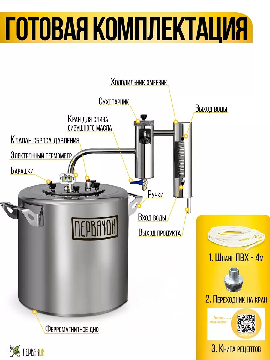 Самогонный аппарат «ПервачОк» Берёзка, 30 литров, бытовой дистиллятор с сухопарником: сравнение цен, характеристики, фото, актуальное наличие и цены.