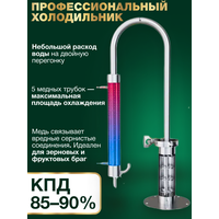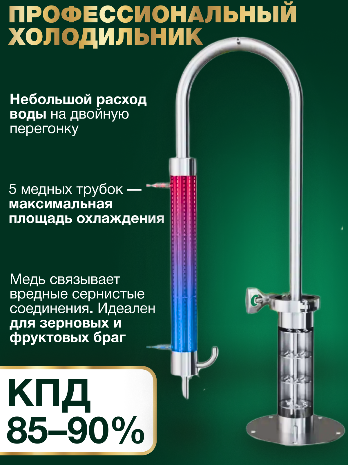 Важное достоинство системы — наличие мощного барьерного трубчатого холодильника (5 трубок) с противоточным подключением. Он оборудован трубкой связи с атмосферой, что позволяет предотвратить захлёб. Применение МЕДНЫХ трубок в холодильнике ускоряет охлаждение, увеличивает выход тела самогона, экономит воду. Такое конструктивное решение позволило увеличить КПД работы системы на 20%.