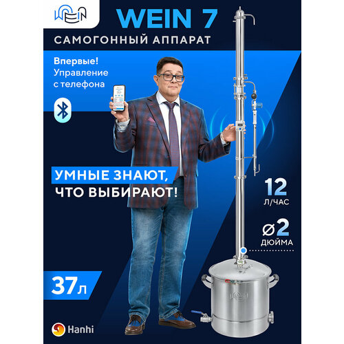 | Дополнительная информация | Wein 7 первый по-настоящему первый умный самогонный аппарат колонного типа на рынке, который способен вас удивить. Дистиллятор Вейн 7 оснащён современной автоматикой, которая управляет 2-й перегонкой при помощи всего одной кнопки. Управляйте перегонкой со смартфона через приложение. Отдыхайте и занимайтесь своими делами пока аппарат гонит. Все уведомления о процессе придут на смартфон. |
