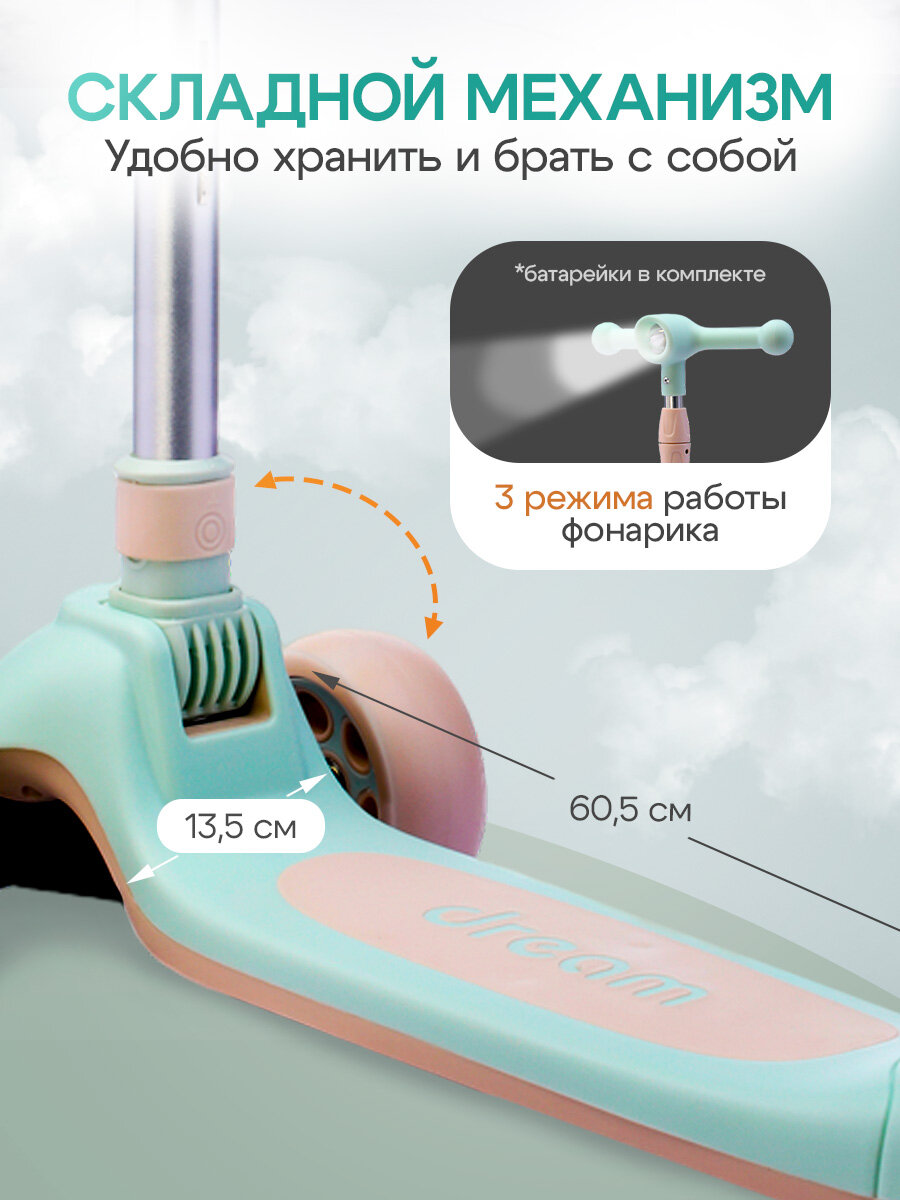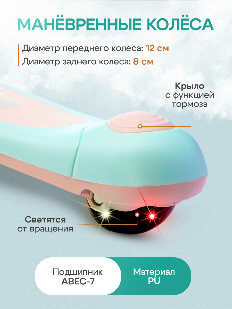 Особенностью этого самоката является светящиеся колеса из полиуретана. Это не только добавляет привлекательности, но и обеспечивает безопасность в темное время суток.
