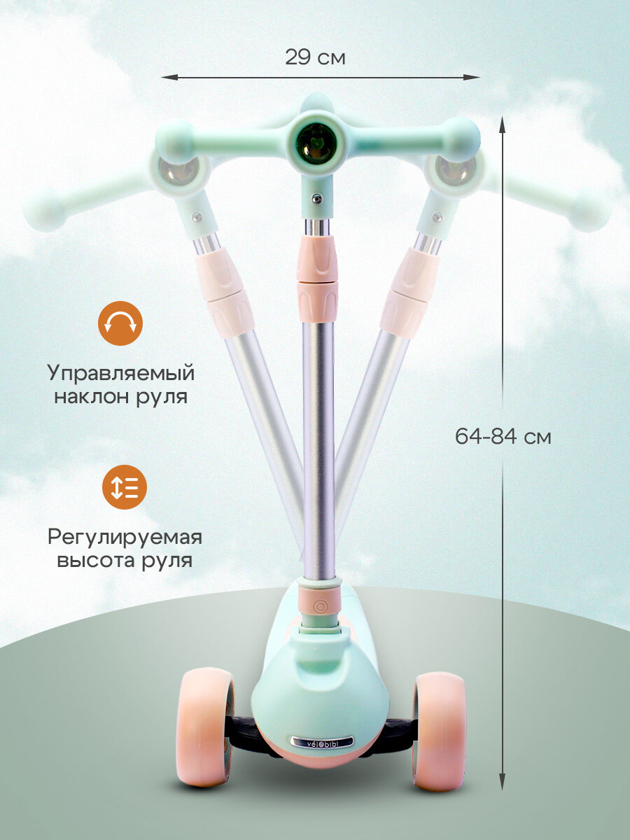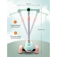 Самокат имеет регулируемую высоту руля от 64 до 84 см, что позволяет адаптировать его под рост пользователя от 80 до 120 см. Максимальная нагрузка на самокат составляет до 50 кг.