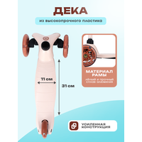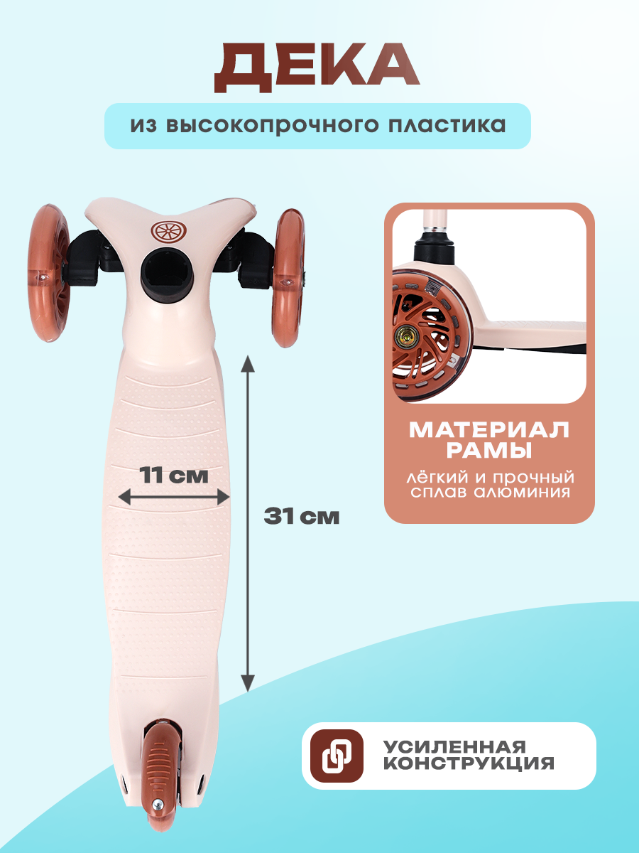 Широкая дека (ширина 11 см, длина 31 см) обеспечивает устойчивость и комфорт, а также позволяет использовать самокат для детей разного роста.