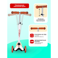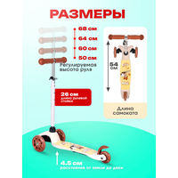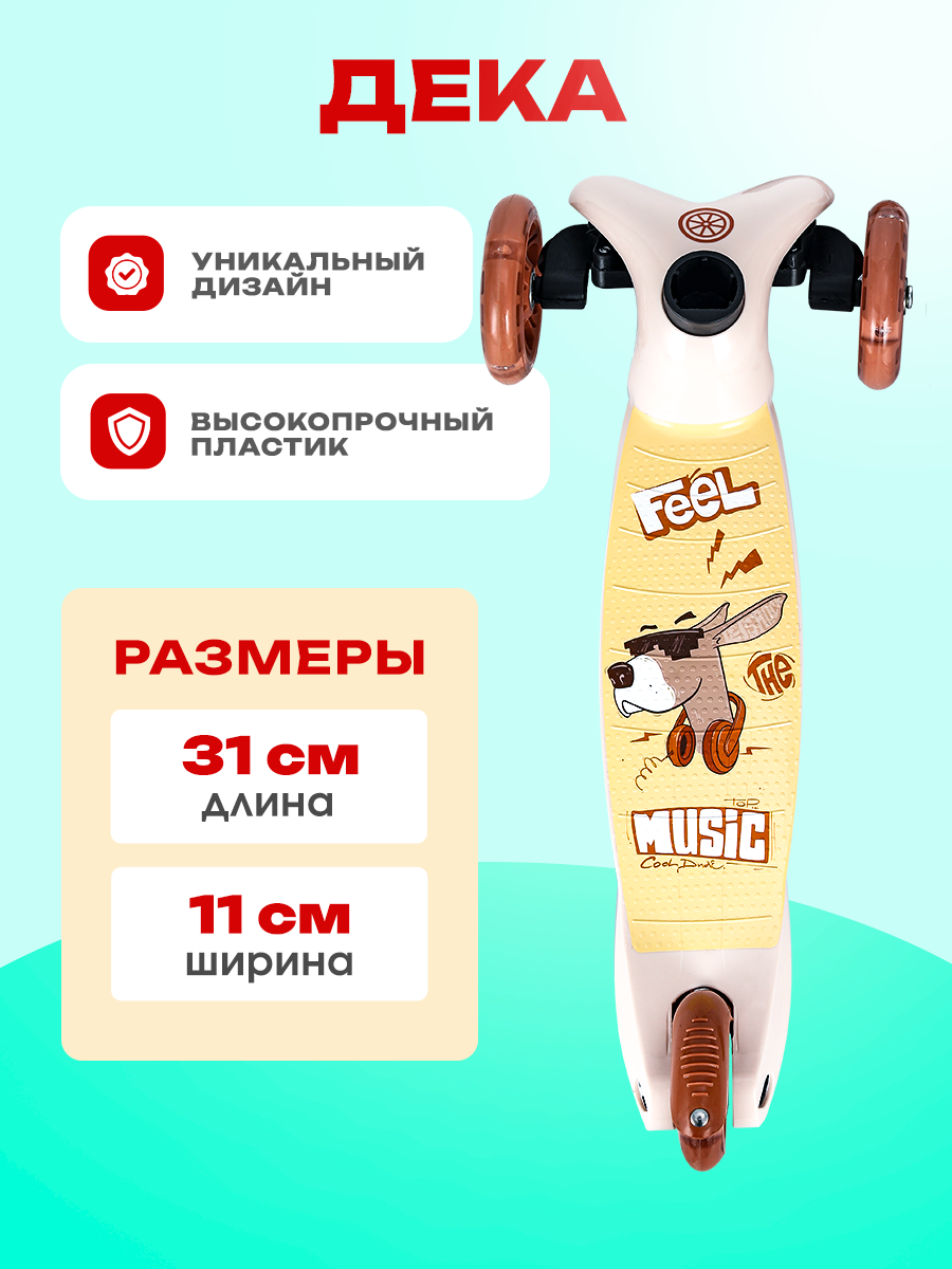 Колеса со светом для безопасности Колеса самоката имеют диаметр 110 мм для передних колес и 76 мм для заднего колеса. Материал колес PU обеспечивает надежное сцепление с дорогой и позволяет кататься на самокате даже в темное время суток.