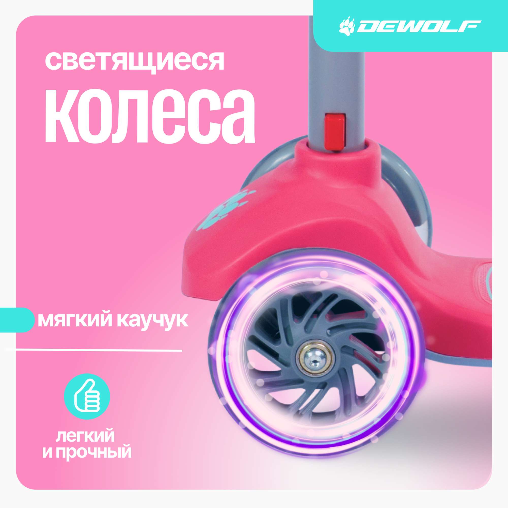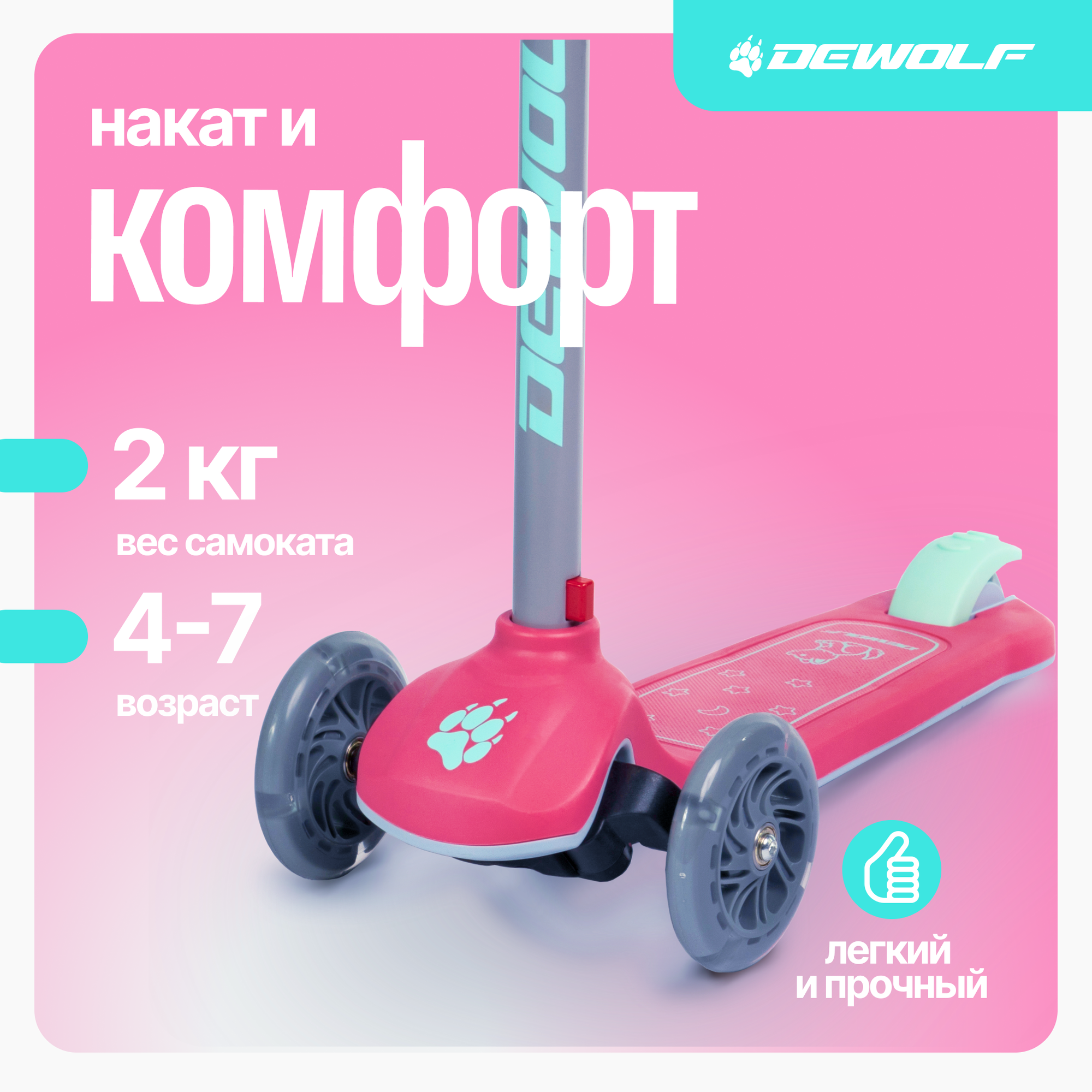 Детский самокат DEWOLF TRILLY 15 создан для детей от 3 лет. Модель оборудована 3 светящимися полиуретановыми колёсами со встроенными светодиодами. Помимо оригинального дизайна TRILLY 15 полностью безопасен: Имеет удобную конструкцию и небольшой вес в 2 кг. Регулируемый по высоте руль надёжно фиксируется по высоте. Комфортная, антискользящая платформа (дека), выдерживающая вес до 50 кг, Интуитивно понятную систему управления, для поворота достаточно наклонить рулевую стойку в необходимую сторону. Полиуретановые колёса с подшипники класса АВЕС-7 обеспечивают отличный накат. Ручки (грипсы) выполнены из износостойкой термопластичной резины, а тормоз самоката удобный, обеспечивающий плавное и надёжное торможение.