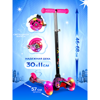 - Данный детский самокат имеет удобную Т–образную телескопическую ручку с розовыми грипсами и светящиеся при движении полиуретановые прозрачные 3 колеса диаметром 110 мм и 75 мм.