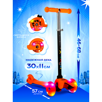 - Данный детский самокат имеет удобную Т–образную телескопическую ручку и светящиеся при движении полиуретановые прозрачные 3 колеса диаметром 110 мм и 75 мм.