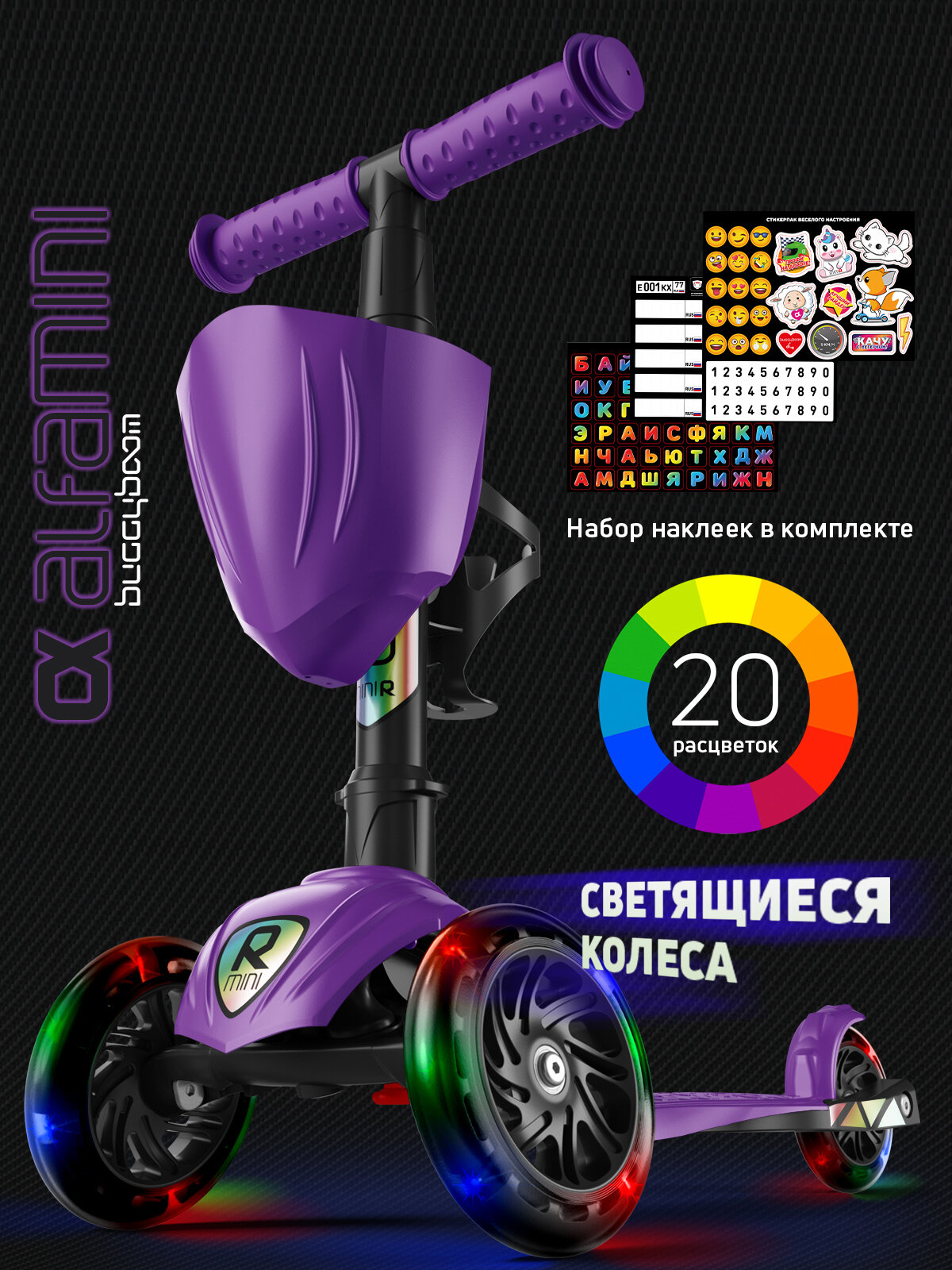 Самокат детский трехколесный с корзинкой, подстаканником для бутылок и наклейками Alfa Mini XR Light от Buggy Boom: сравнение цен, характеристики, фото, актуальное наличие и цены.
