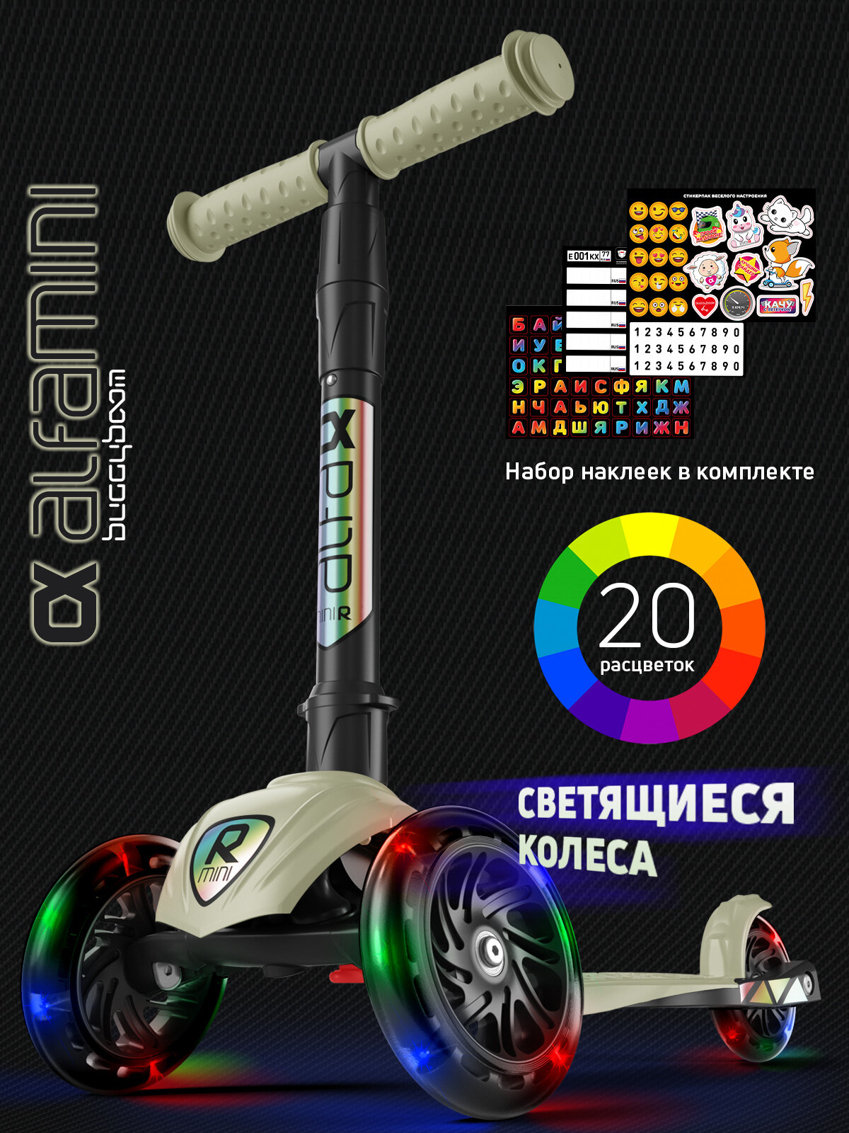 Купить Самокат детский трехколесный со светящимися колесами и наклейками Alfa Mini R Light от Buggy Boom с доставкой по всей России.